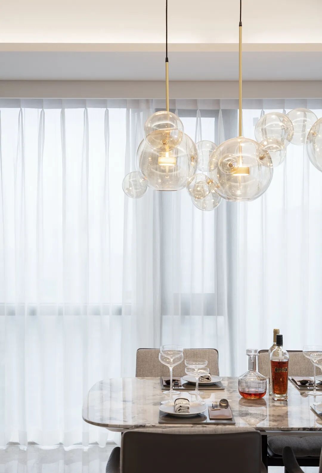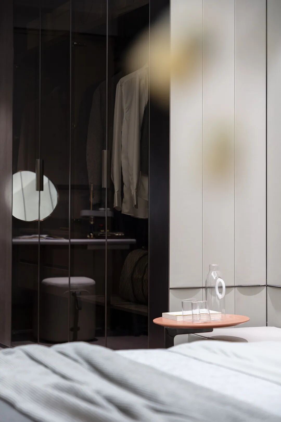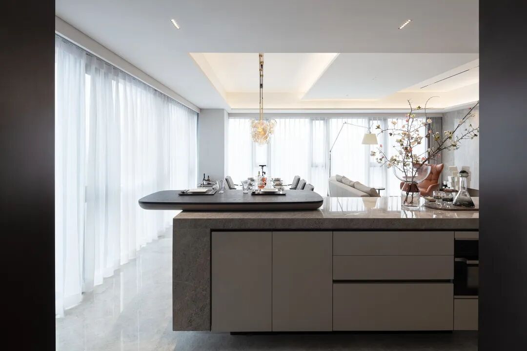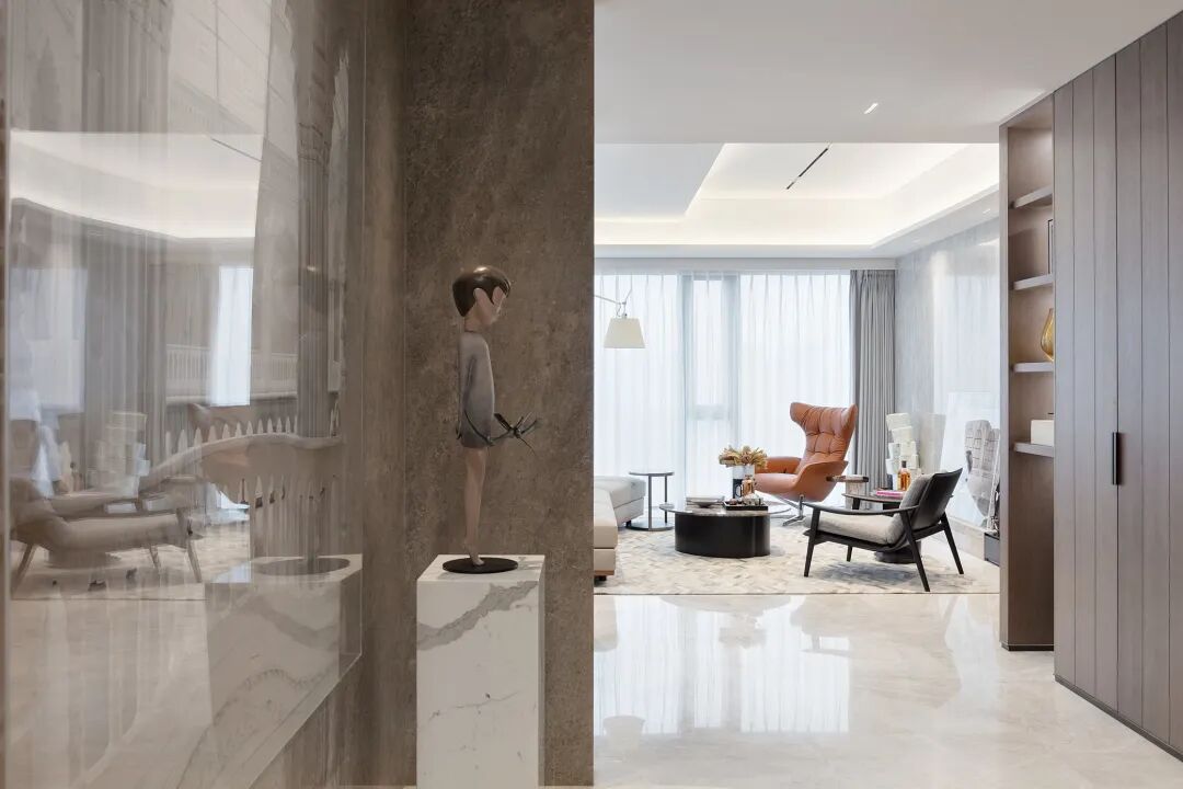 进入玄关,艺术玄关带来了画廊般的高洁品质。同时门口也藏有一个独立的家政空间,容纳了家庭日常洗衣和各类清洁需求。两面完整的落地玻璃幕墙,为客厅引入了绝佳的采光,在阳光照洒进室内时,带来一种超越语言的纯粹感。