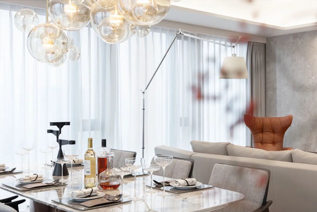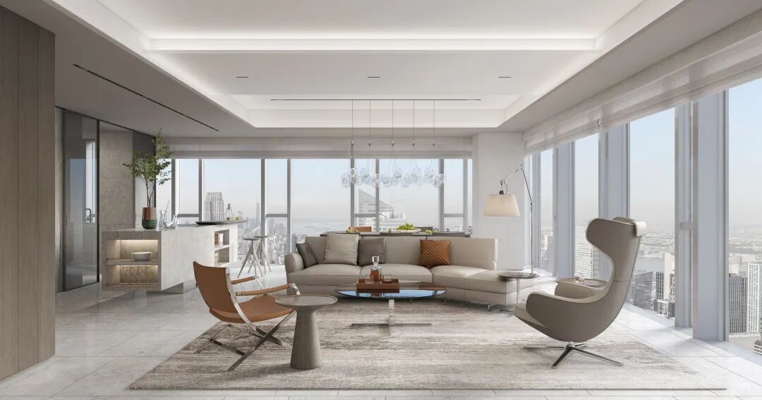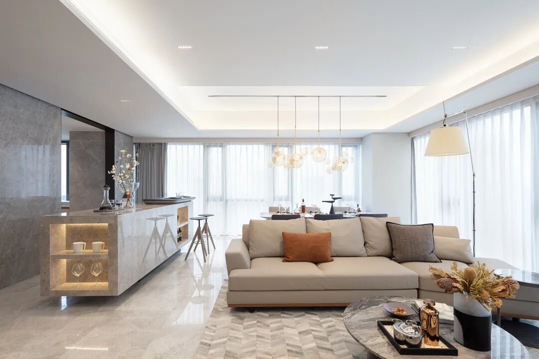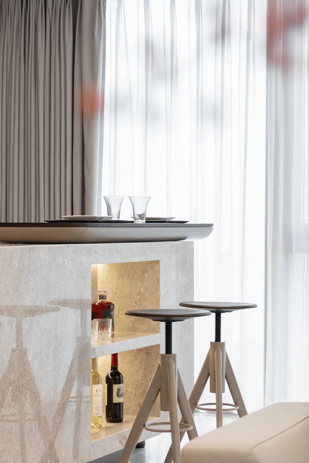 进入玄关,艺术玄关带来了画廊般的高洁品质。同时门口也藏有一个独立的家政空间,容纳了家庭日常洗衣和各类清洁需求。两面完整的落地玻璃幕墙,为客厅引入了绝佳的采光,在阳光照洒进室内时,带来一种超越语言的纯粹感。