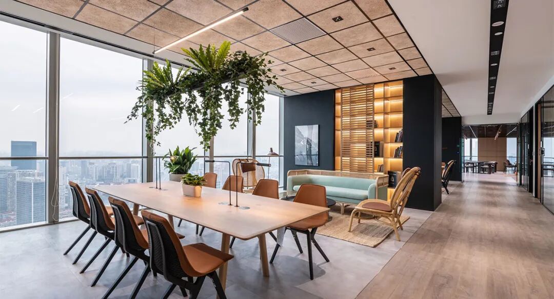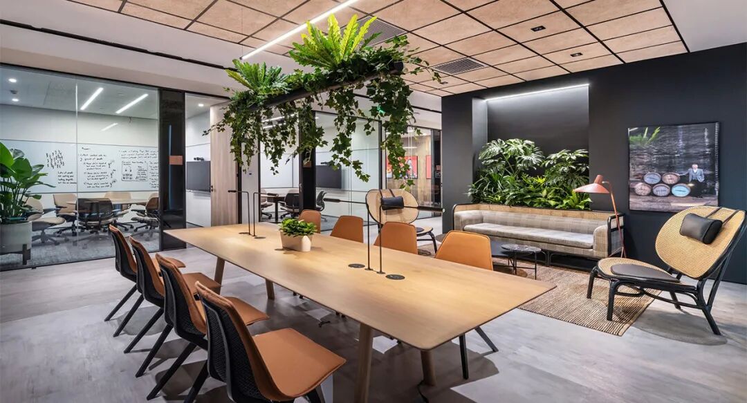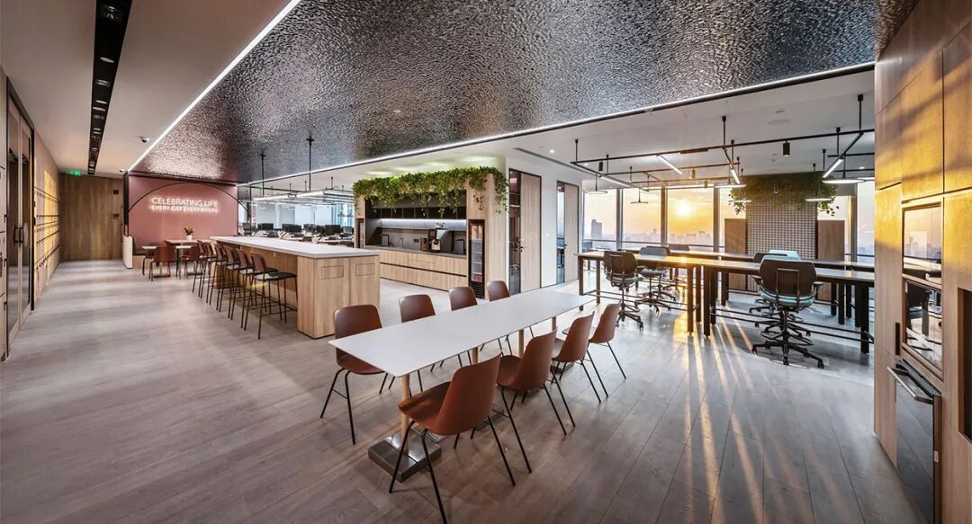 独立空气净化系统、全感应LED灯光系统,明亮开放的空间加之随处可见的绿植——彰显了Diageo对员工身心健康无微不至的关怀,且办公空间中大量应用环保及可回收材质,体现着Diageo对践行可持续愿景的坚持,同时也是对其“2030实现净零排放”目标的有力支持。