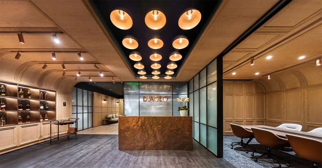 自到访开始,整个办公空间营造了醇馥的沉浸式品牌环境。到访区使用了可回收利用的铜材质,不仅反映了Diageo“可持续”的环保承诺,更模拟出流动的杯中质感。