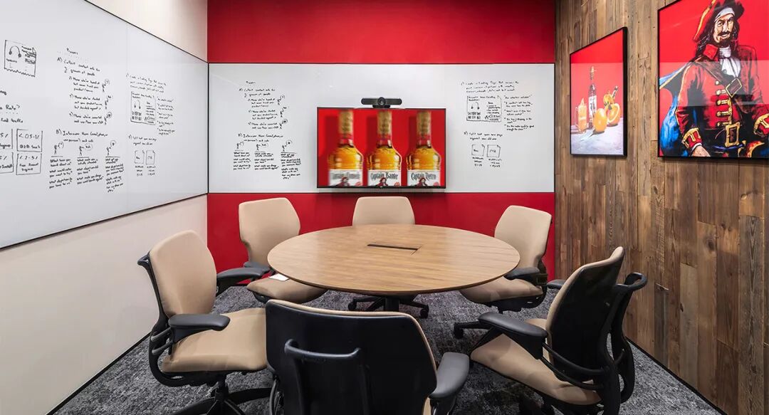 会议室的主题以Diageo标志性的酒品牌命名,并参照不同品牌的独特风格进行巧妙设计。以Johnnie Walker为主题的董事会议室中,软木材质的背景上绘制着Johnnie Walker的发展故事,交织着国际视野与上海本土化元素。此外,会议室墙上展示的蒸馏技术以及对于酒桶木板材质的应用,无不在细节中诉说着丰富的品牌沉淀。