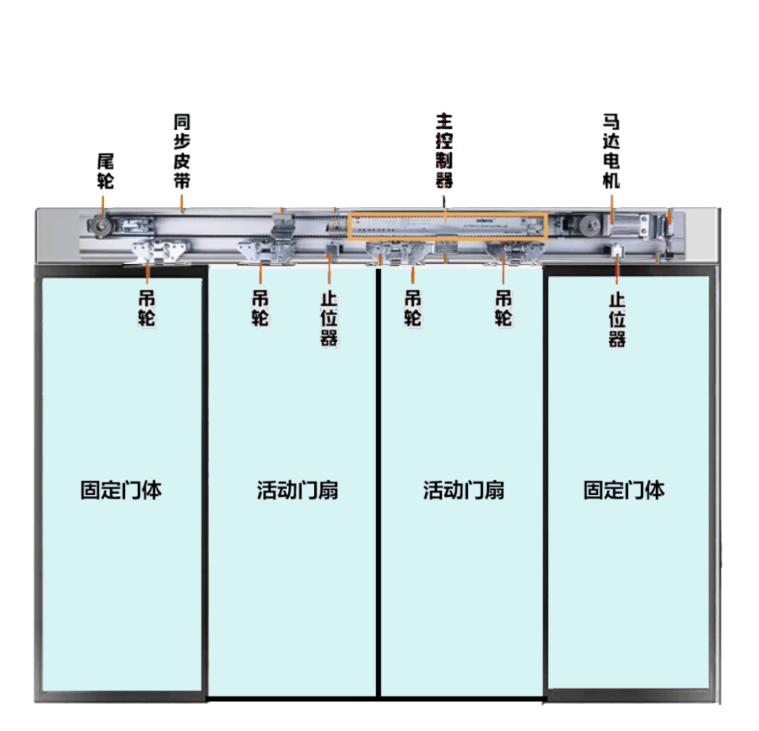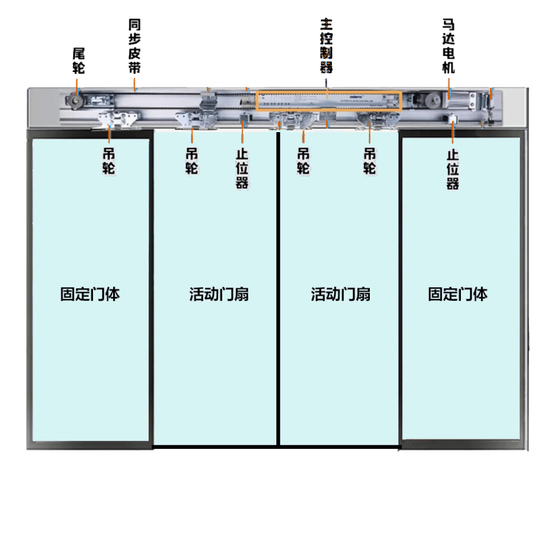 门机系统则相对复杂,主要由感应探测器、驱动轨道(门扇行进轨道)、动力马达、主控制器、门扇吊具走轮系统、同步皮带和止动器7大部分组成。