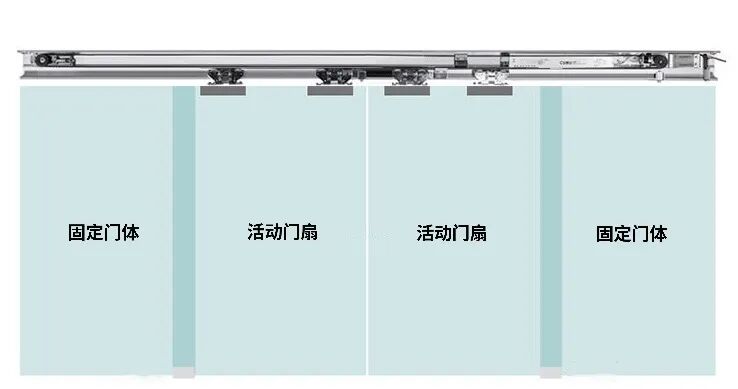 安装门机、活动门扇系统的流程是:感应探测器→动力马达→主控制器→尾轮→同步皮带→两端止动器→吊夹及活动门扇玻璃→吊轮→防脱片→连接固定皮带及吊夹→中间止动器→连接探头接线。