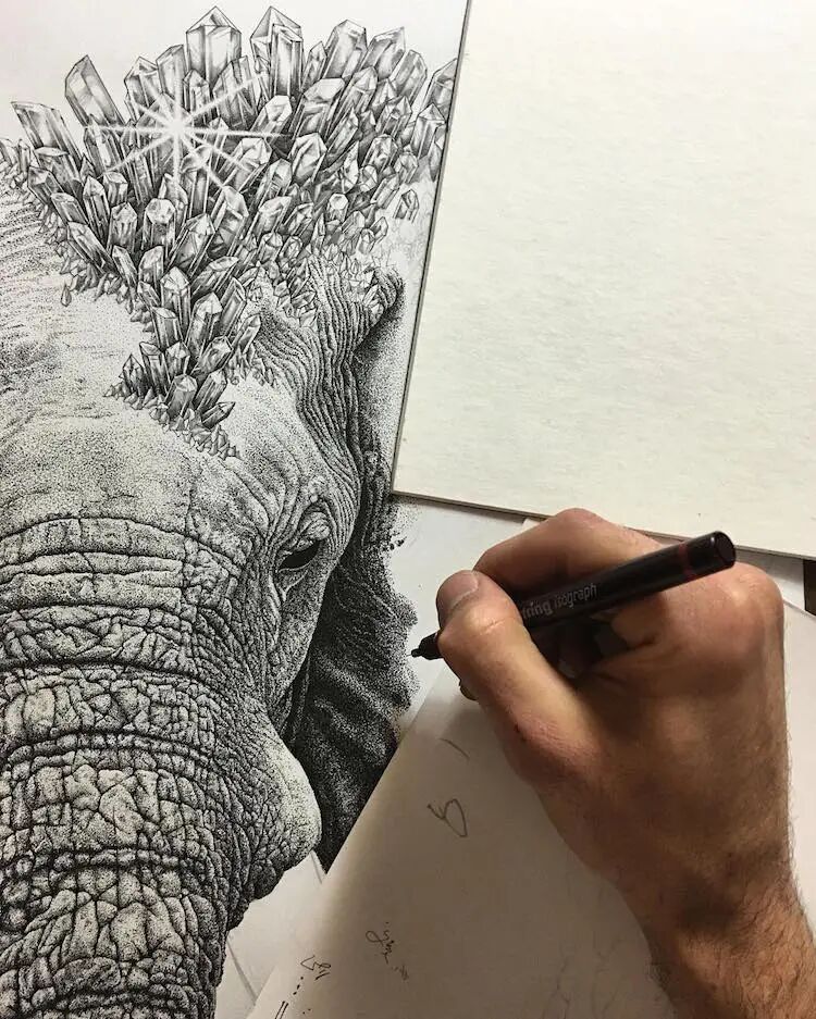 顶级的点画艺术家并不多见,来自盐湖城的点画家贝克算是一位,他凭借一幅头部装饰钻石的大象点画作品被人们熟知。这幅画作前前后后用了8个月的时间,画作上的点多达数百万个。