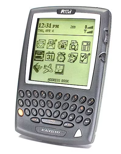2000年,第一款黑莓也上市了,黑莓当时仍与发布它的公司RIM同名,它在全球取得了成功,奠定了个人数字处理工具发展的基础,这是一款可以像计算机一样工作的手机,可以发送和接收电子邮件。它也是第一款引发关于依赖现代通讯工具的争论的手机。