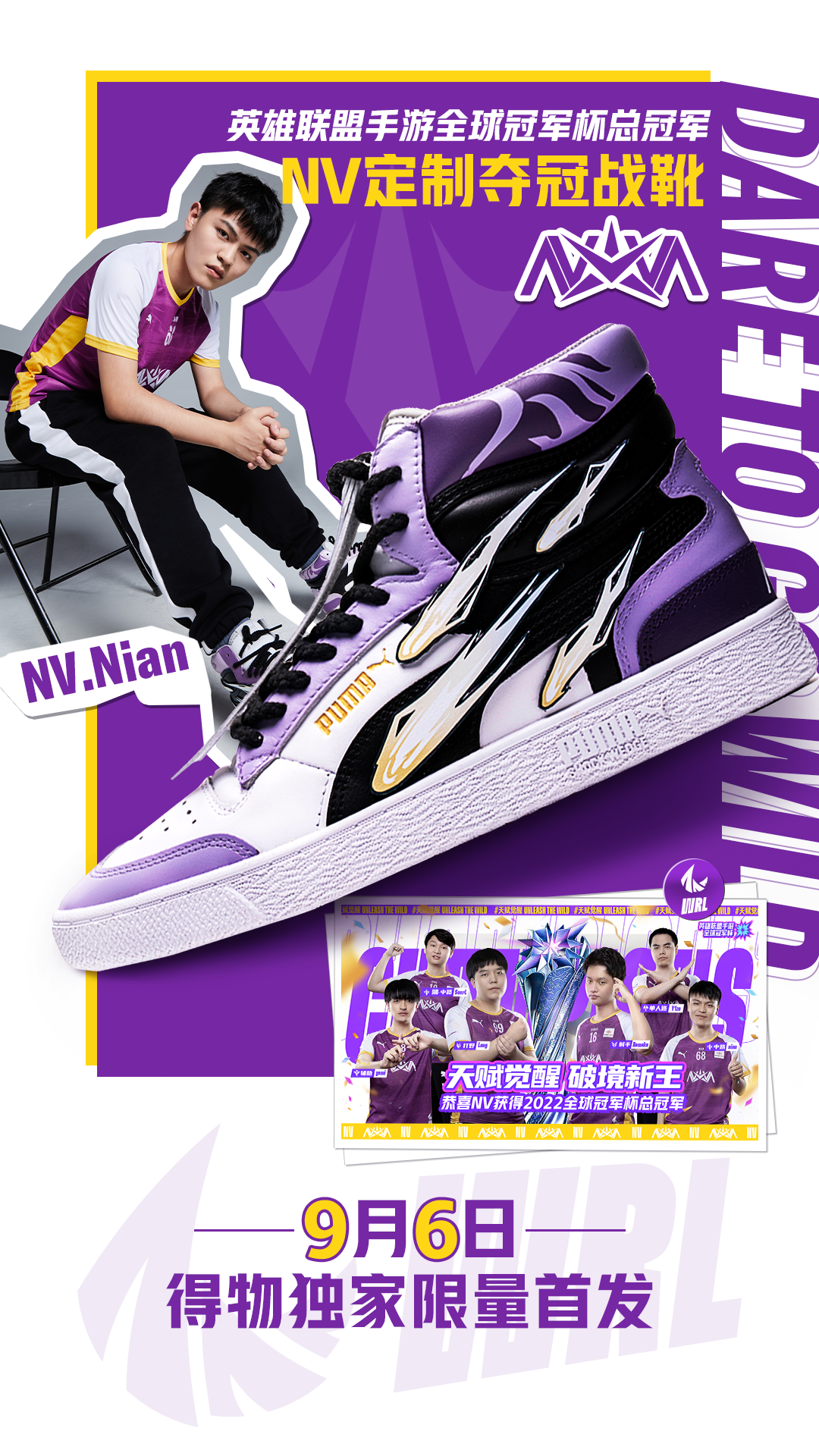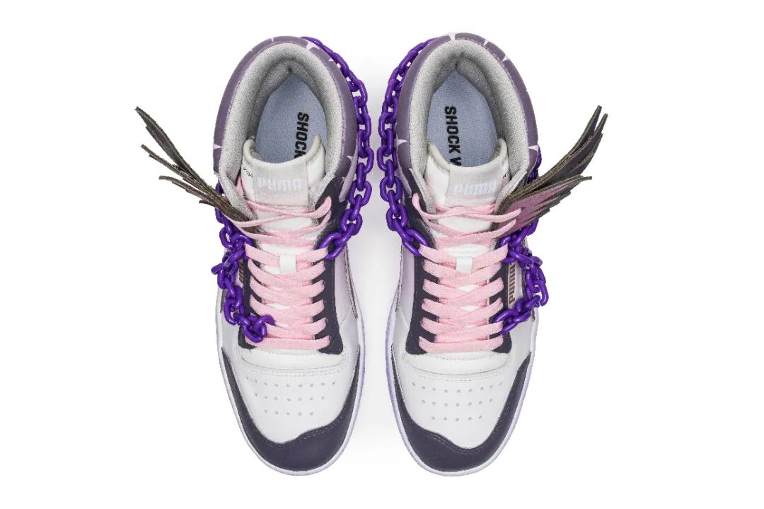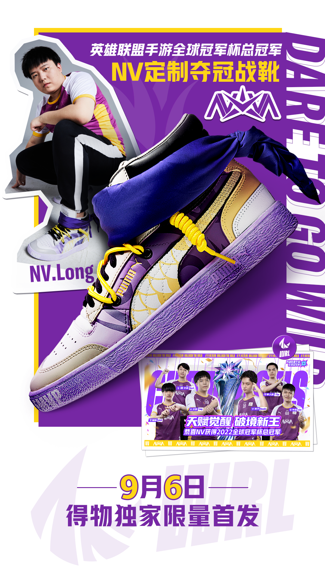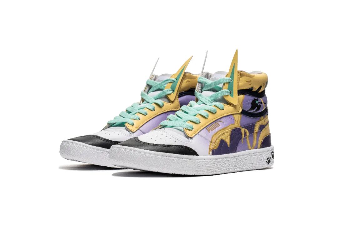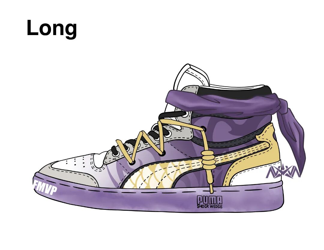 龙是NV战队Long选手热衷的元素,该款式中龙鳞围绕鞋身寓意巨龙藏于云雾中,同时Long FMVP获得者的身份也被搬到鞋头,彰显出该选手在比赛上的出色发挥;鞋口处的紫色绑带灵感则是来自Long的拿手英雄——盲僧的眼罩。
