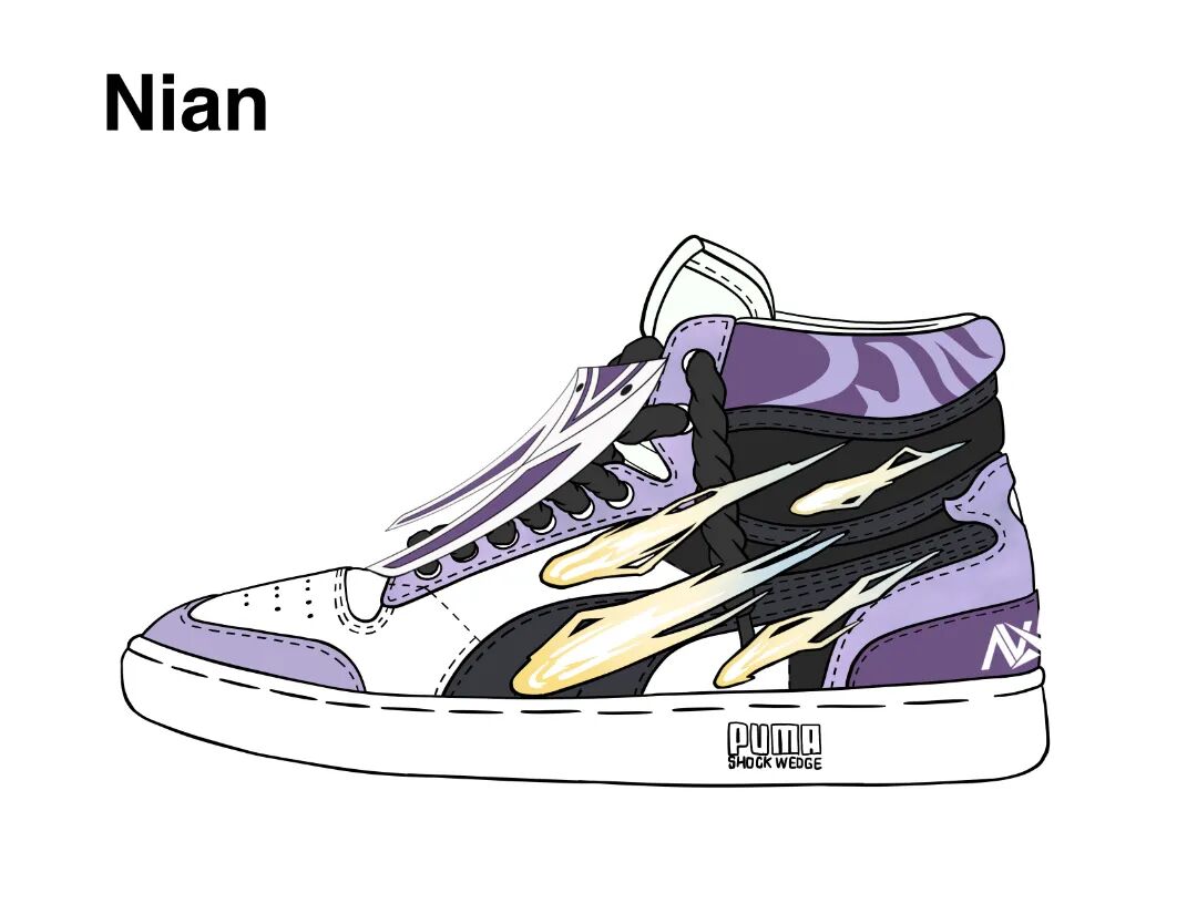 Nian战靴以卢锡安为创作灵感,卢锡安这个英雄的经典形象就是双枪元素,由此Nian战靴左右脚设计上也略有不同,充分展现出英雄的特点。鞋帮暗纹来自于卢锡安双枪的花纹,鞋身Logo为卢锡安4技能标识,鞋盖则来自于卢锡安的风衣;同时Nian对于太极阴阳平衡十分感兴趣,整双鞋的配色则加入了黑白平衡特点。