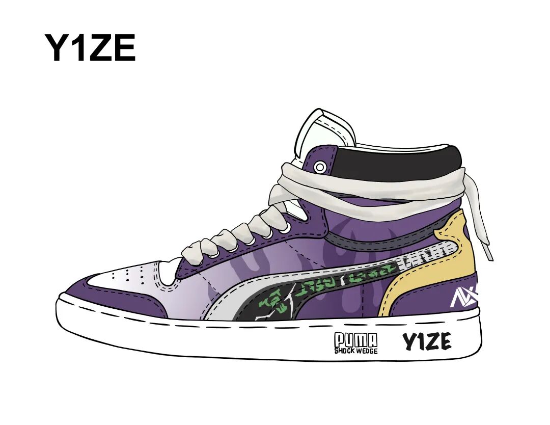 Y1ZE以锐雯为战靴主题,鞋身Logo处刻画了锐雯的代表形象元素——符文大剑,捆绑宽鞋带则是代表锐雯手上的绷带元素,鞋身的火焰暗纹则是Y1ZE上单极强统治力的具象化的外在展示。