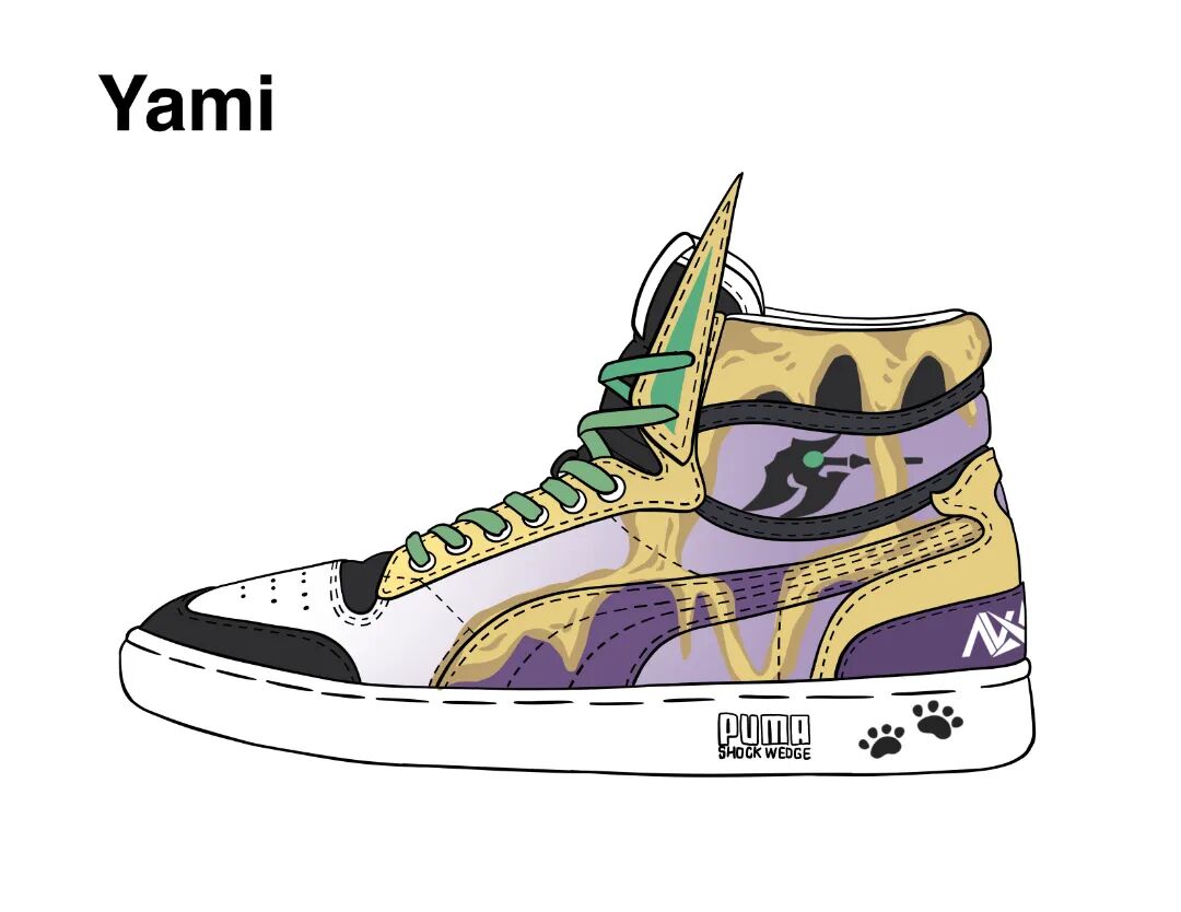 Yami的代表英雄为内瑟斯,沙漠死神流沙元素遍布整鞋,武器斧头标识位于鞋帮处,鞋舌旁特别增加内瑟斯的耳朵。Yami是一位养猫爱好者,在沟通交流中他特别提到了想把猫的元素融入进这次定制战靴的设计里,配合着选手的心愿,他的款式中底后跟特别增加了猫咪的脚印。