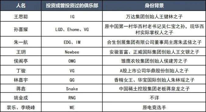 EDG的创始人朱一航是地产企业合生创展创始人朱孟依之子。朱孟依的女儿朱桔榕已经正式接棒家族企业,而朱一航则将更多的精力放在自己的兴趣爱好上;IG俱乐部背后是万达集团董事长王健林的独子王思聪,其电竞版图里还包括“香蕉游戏”、“钛度”、“ImbaTV”等。
