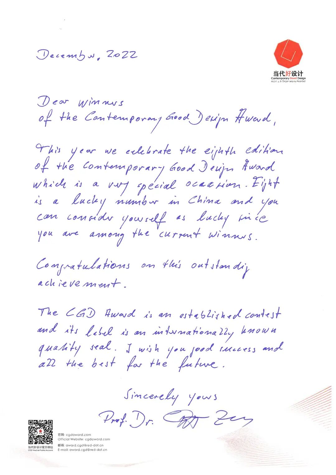 除此之外,彼得·扎克教授博士还亲手为获奖者们写了一封手写信,期许所有的获奖者在设计的道路上继续一往无前,所向披靡。