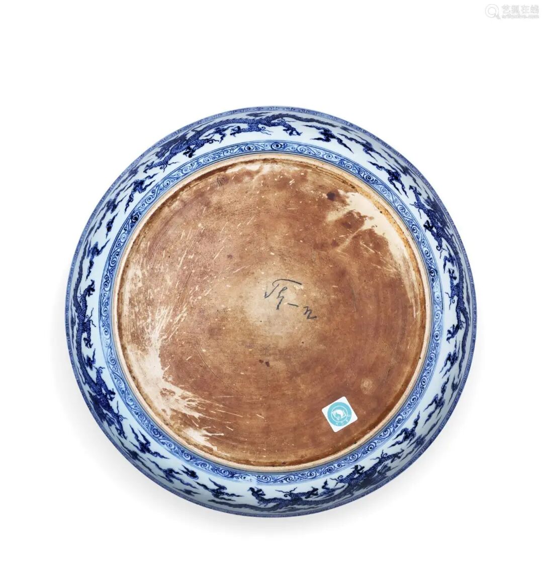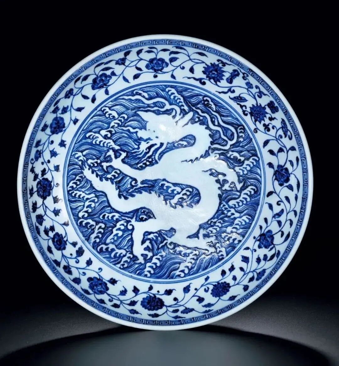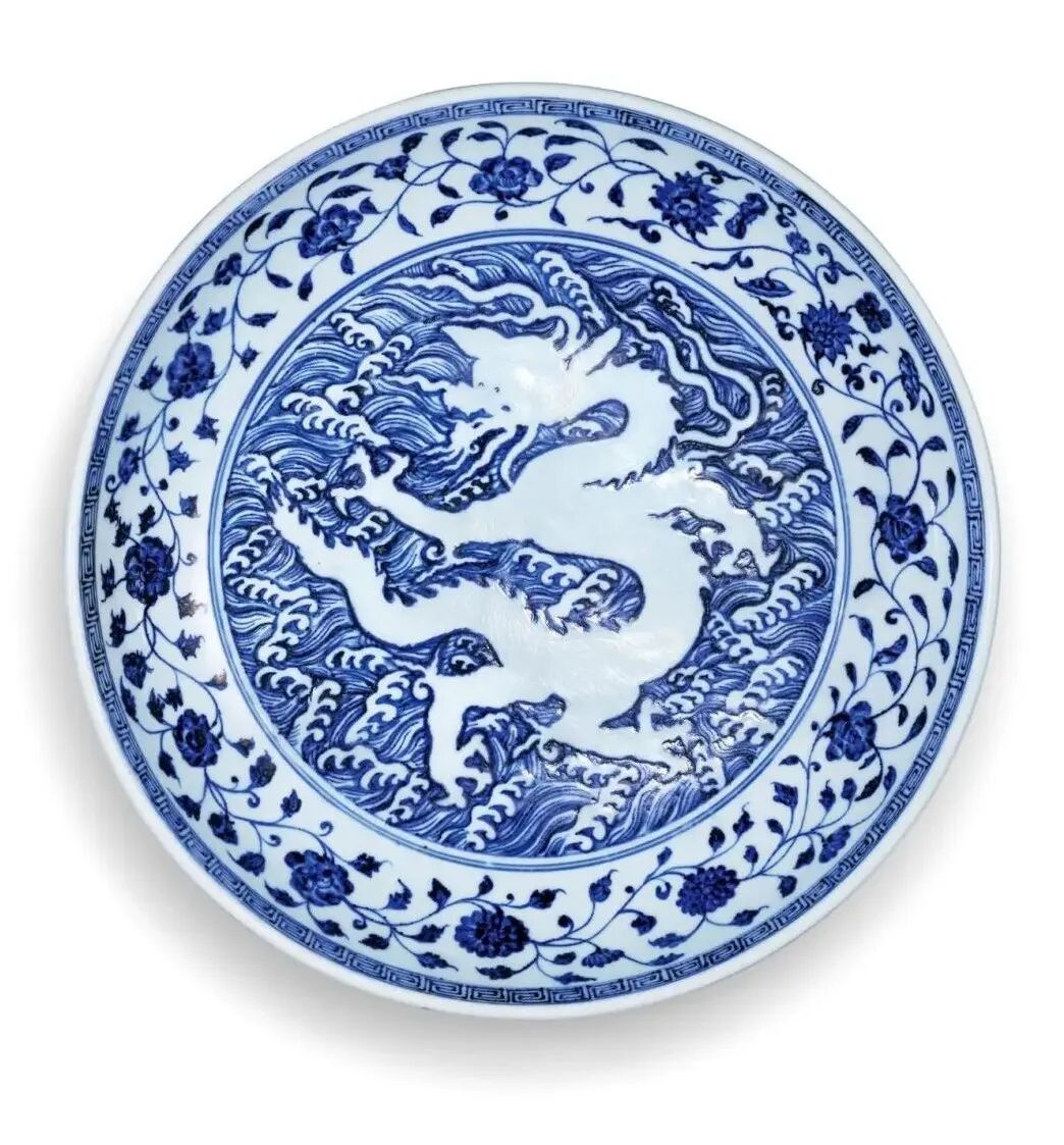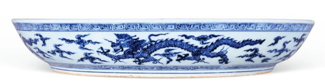 本件大盘形制规整,大口微敛,弧腹广底,浅圈足,为明初大体量盘式的经典造型。通体青花描绘纹饰,内壁绘牵连缠绕的缠枝花卉十二朵;外壁绘奔龙四条,其间以壬字云纹间隔。盘心留白而成的白龙纹样于明初青花器中十分罕见,并多为袭宋元遗风的三爪龙形。采用此种技法者,所见均为御窑重器,以天球瓶最为知名,此外还有梅瓶、大碗等造型。