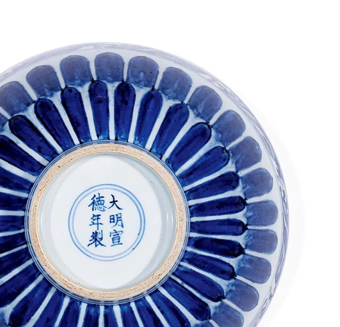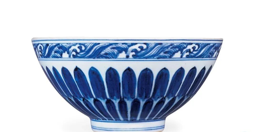 明宣德 青花缠枝花卉菊瓣海浪纹大碗