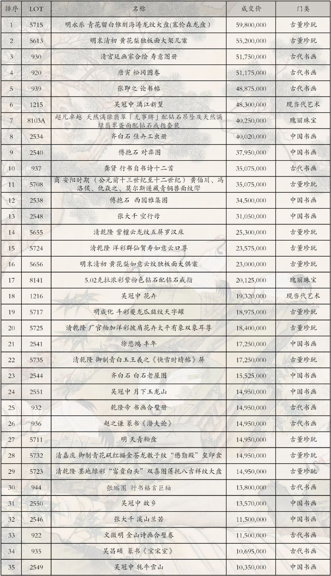 这场刚结束不久的开年大拍以23.6亿元圆满收官,其中35件拍品超千万元,各版块都成交喜人。这次拍卖既是2022的延续,亦为2023的开端,共同为2023年的艺术品拍卖市场释放出积极信号。