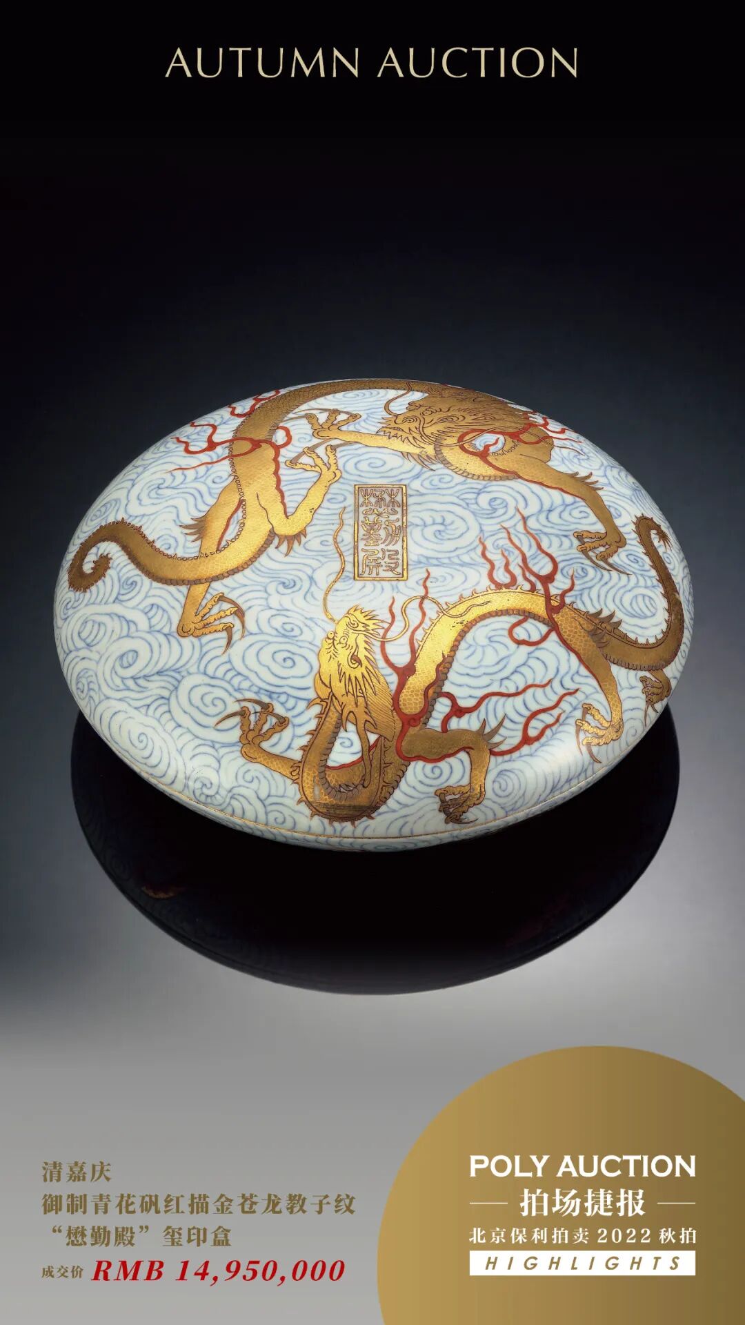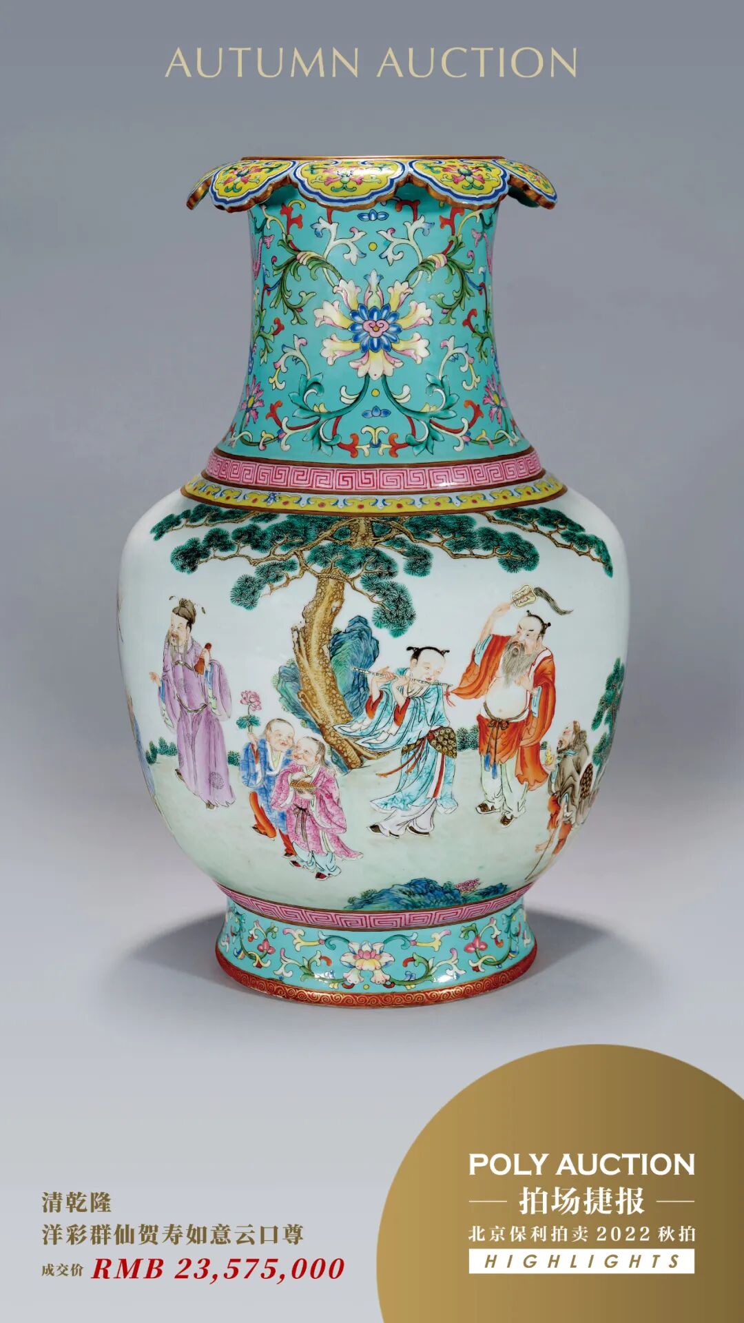 清乾隆洋彩群仙贺寿如意云口尊以2357.5万成交;清乾隆厂官釉加洋彩披肩花卉太平双象耳尊成交价为1840万;另外,明代天青釉盘和清嘉庆御制青花矾红描金苍龙教子纹硬盒等好瓷也超千万级别。