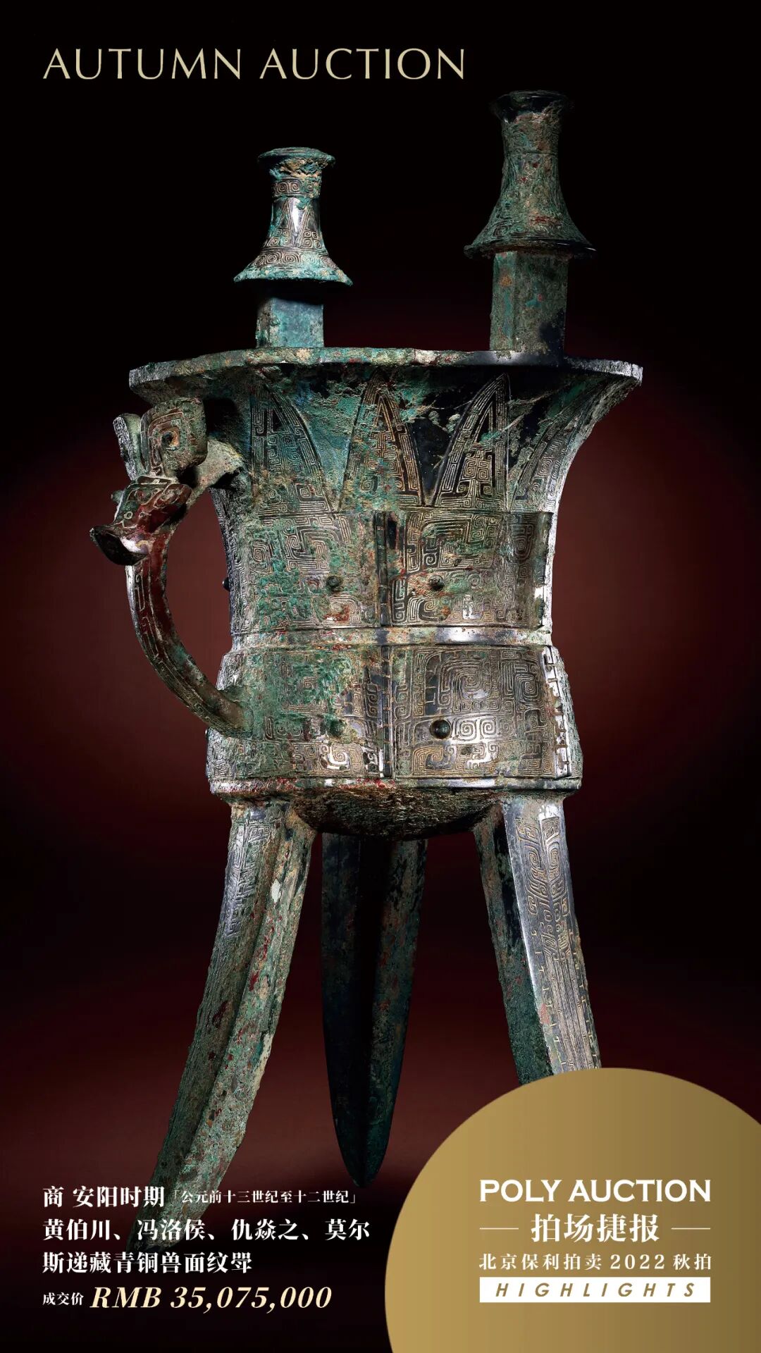 斝中王者——青铜兽面纹斝以3507.5万元成交。一代绝品明成化斗彩夔龙瓜瓞纹天字罐以1897.5万元成交。