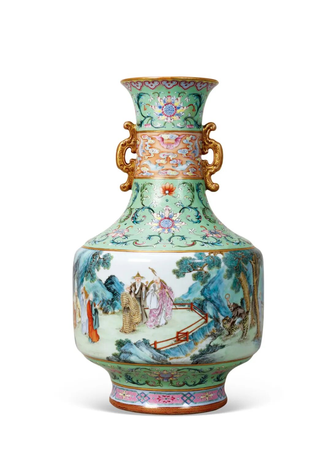 清乾隆·洋彩绿地轧道洋花通景「十八罗汉」双耳瓶