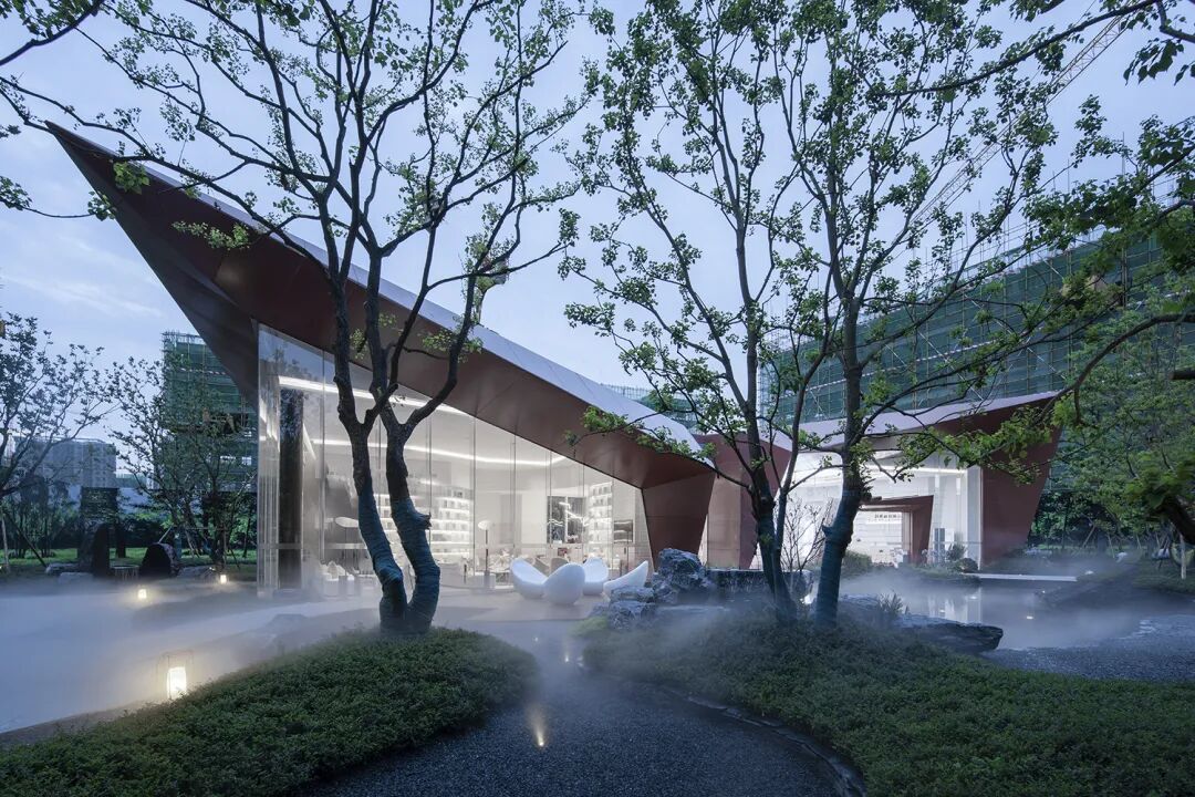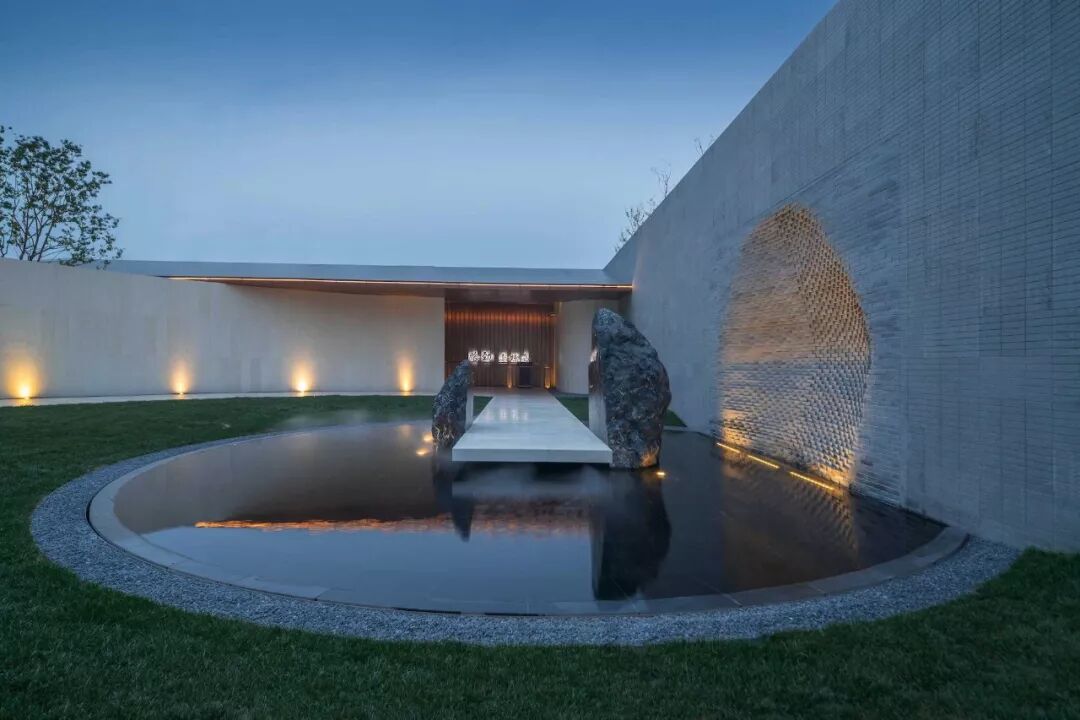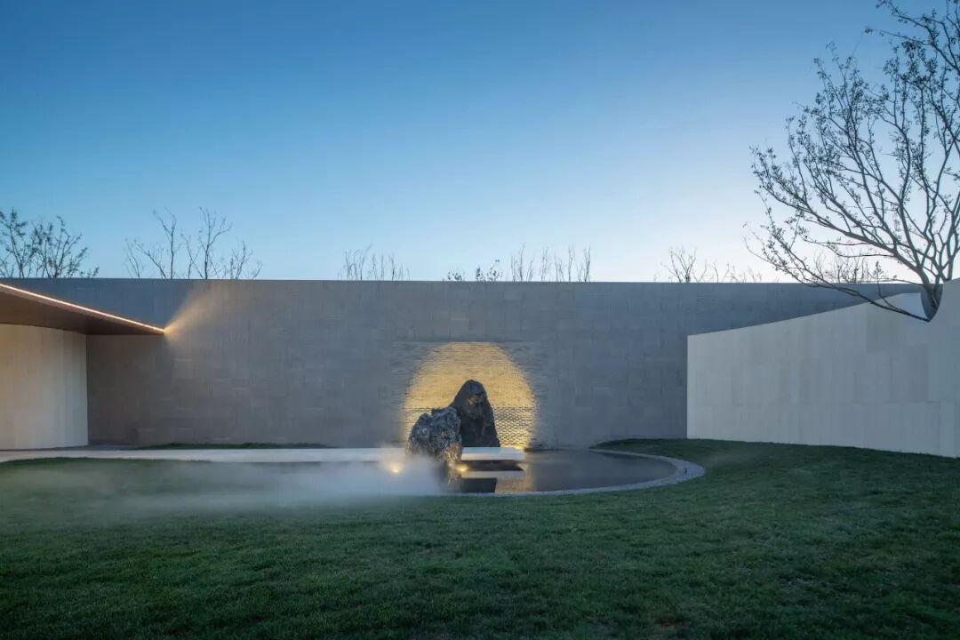 境之礼心于,“开山劈石”既是门前雕塑,也是美好寓意。环抱于创意的圆形景墙中央,宁静又不失境界。圆形的凹墙,白天寓意着“开山劈石”的力量,夜间追光灯的景色又衬托了主题的焦点感,喷雾恰到好处的使用,让整个门庭显得格外意境。