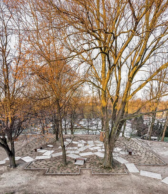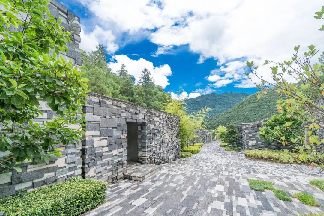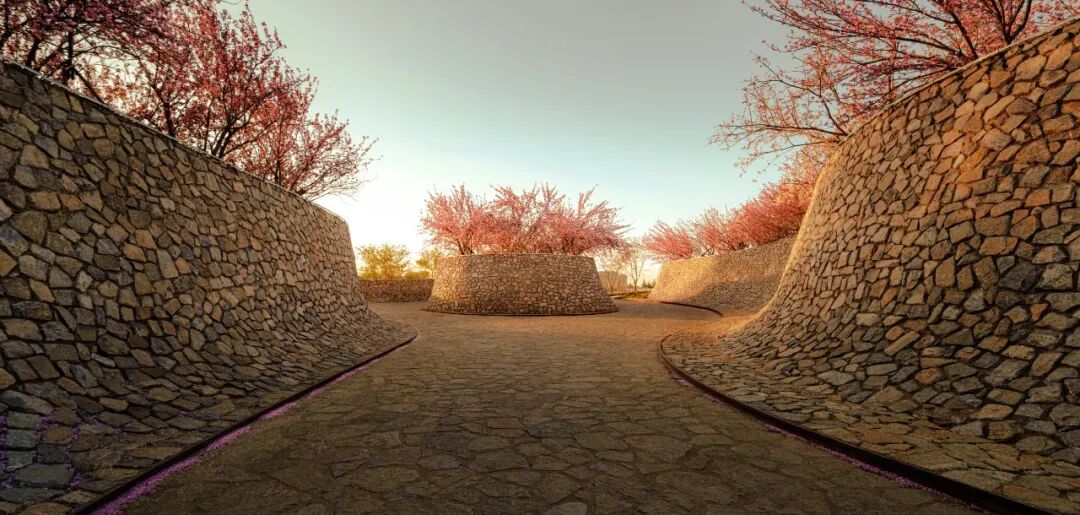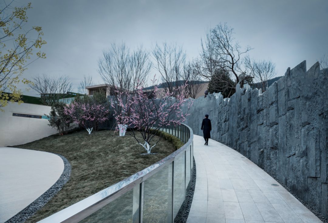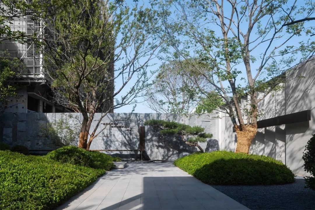 △乔木映衬的步道的尽头是层次丰富的景墙对景