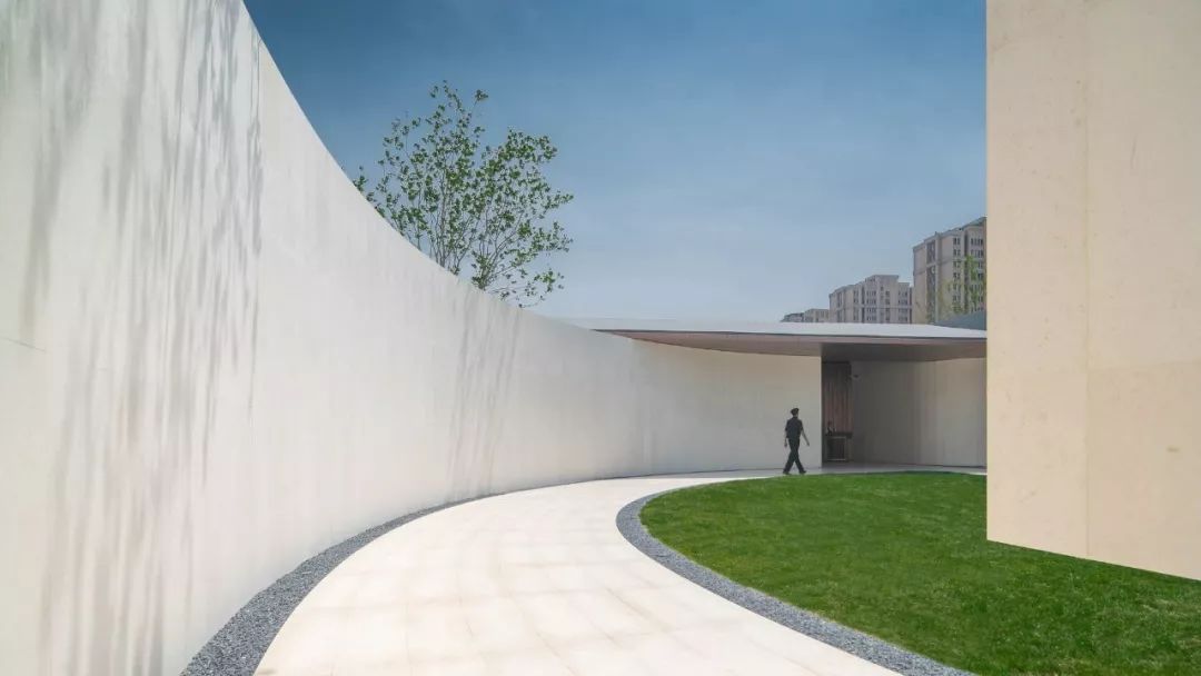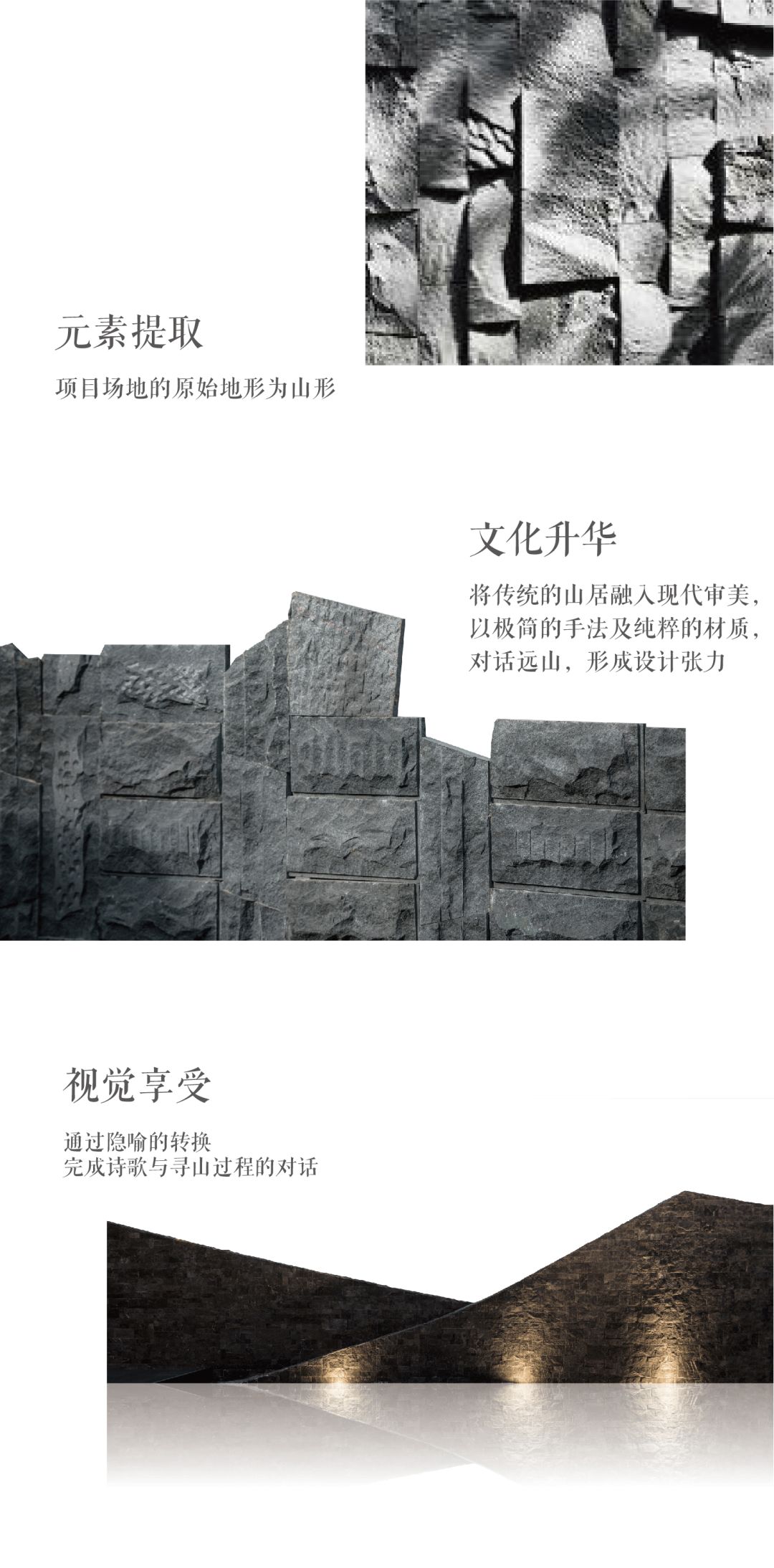 圆形的墙体空间布局,环抱着开山劈石的力量,留白的空间背景只为衬托一个设计主题,此力量余威击凹墙体,弹破石门。门庭、门径、门院三重大门的空间布局,塑造起礼心、礼身、礼境的府门三境界。致敬府门两千年,再起尊贵于当下于空间。