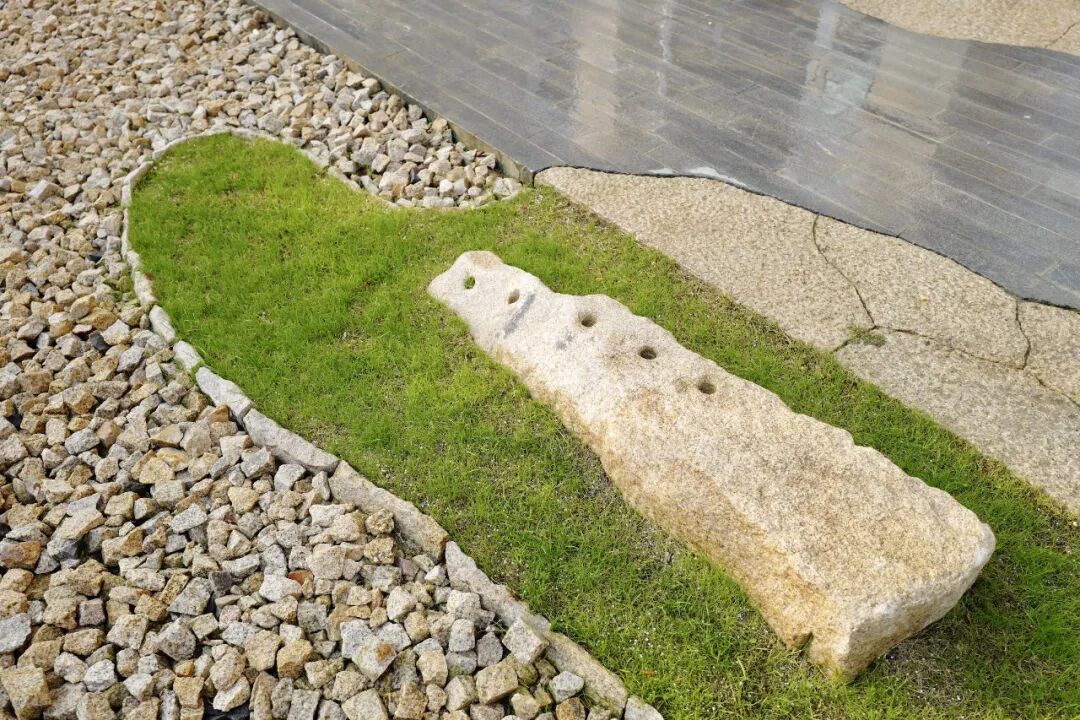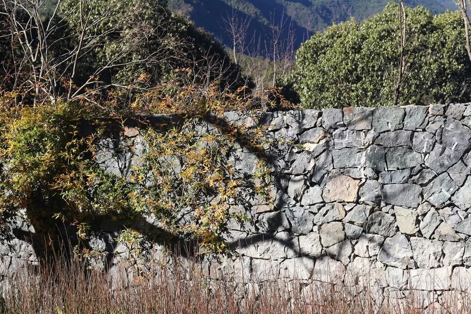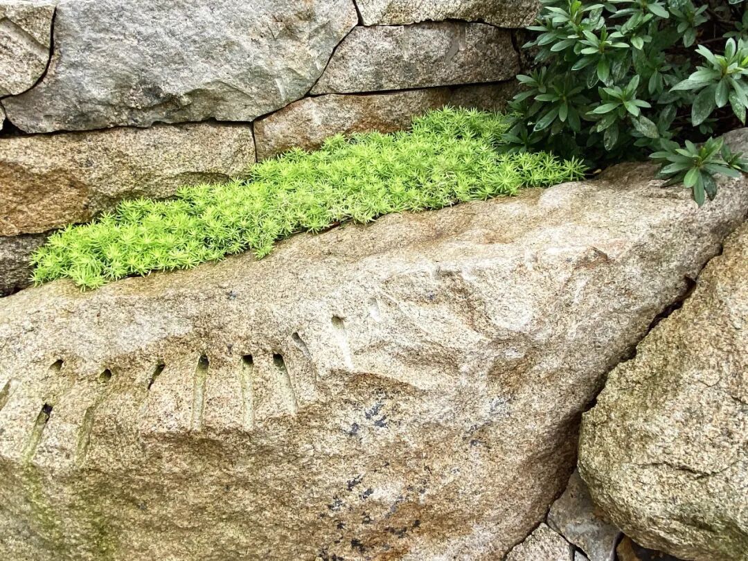 石材之间缝隙的处理是此处至关重要的点睛之笔,每一条缝隙都必须经过仔细考量推敲,尽量模仿自然石缝的走势、宽窄、深浅。在较宽的缝隙处嵌以草皮、藤蔓,植物的点缀为山石注入了呼吸,也使得这一方人工的山墙石壁获得了深山的野趣与生命力。