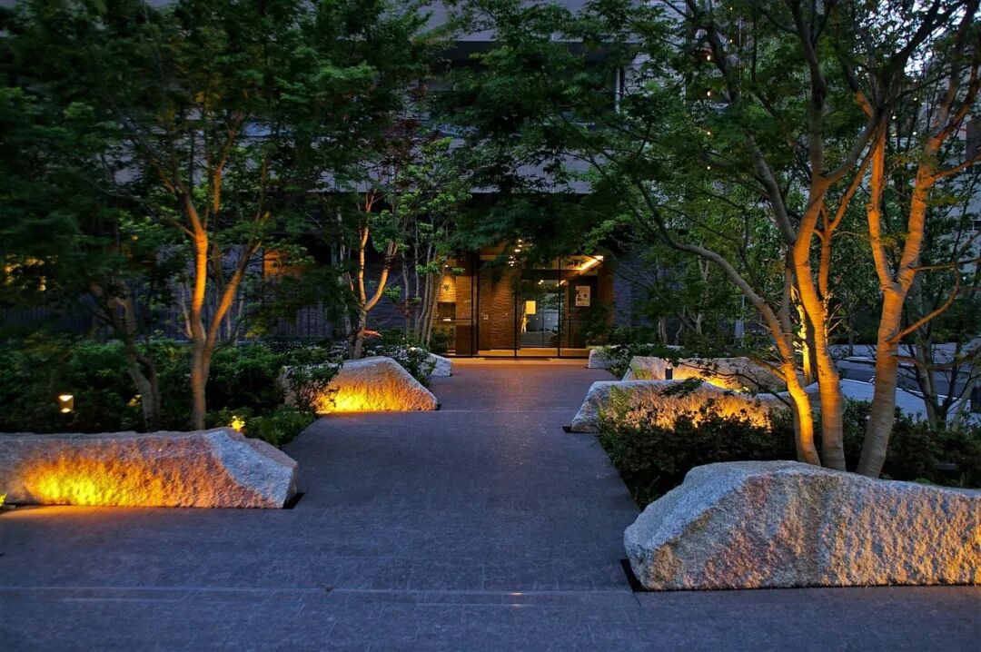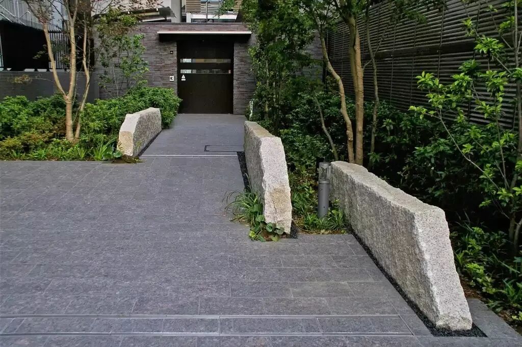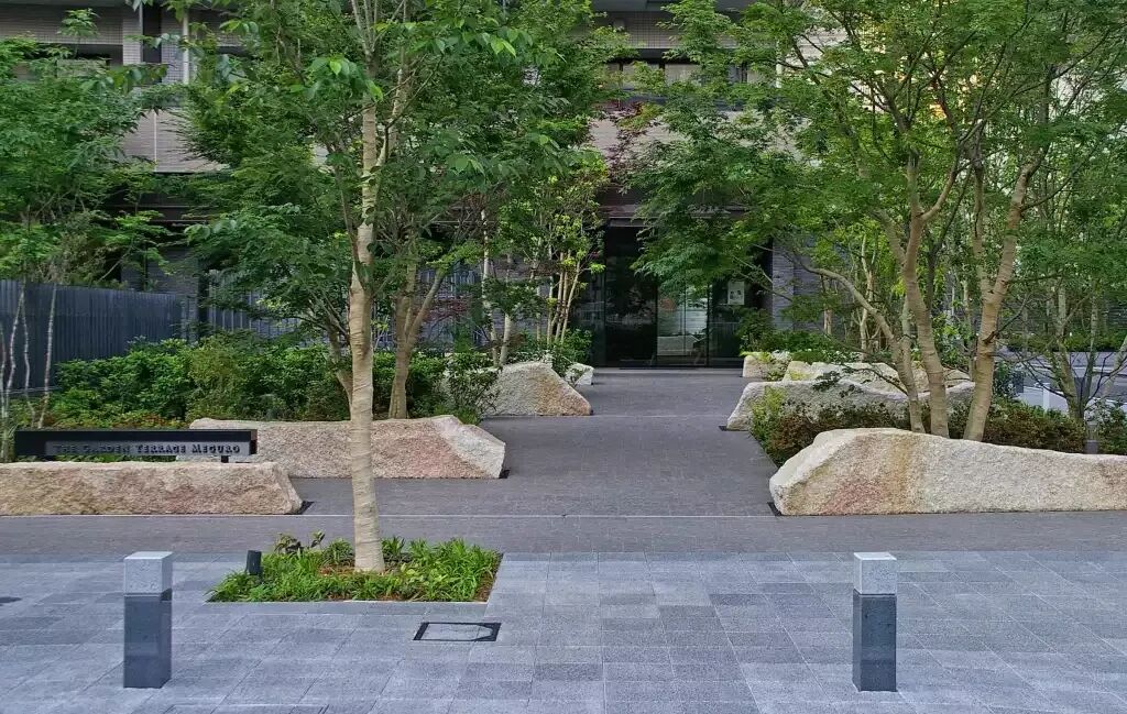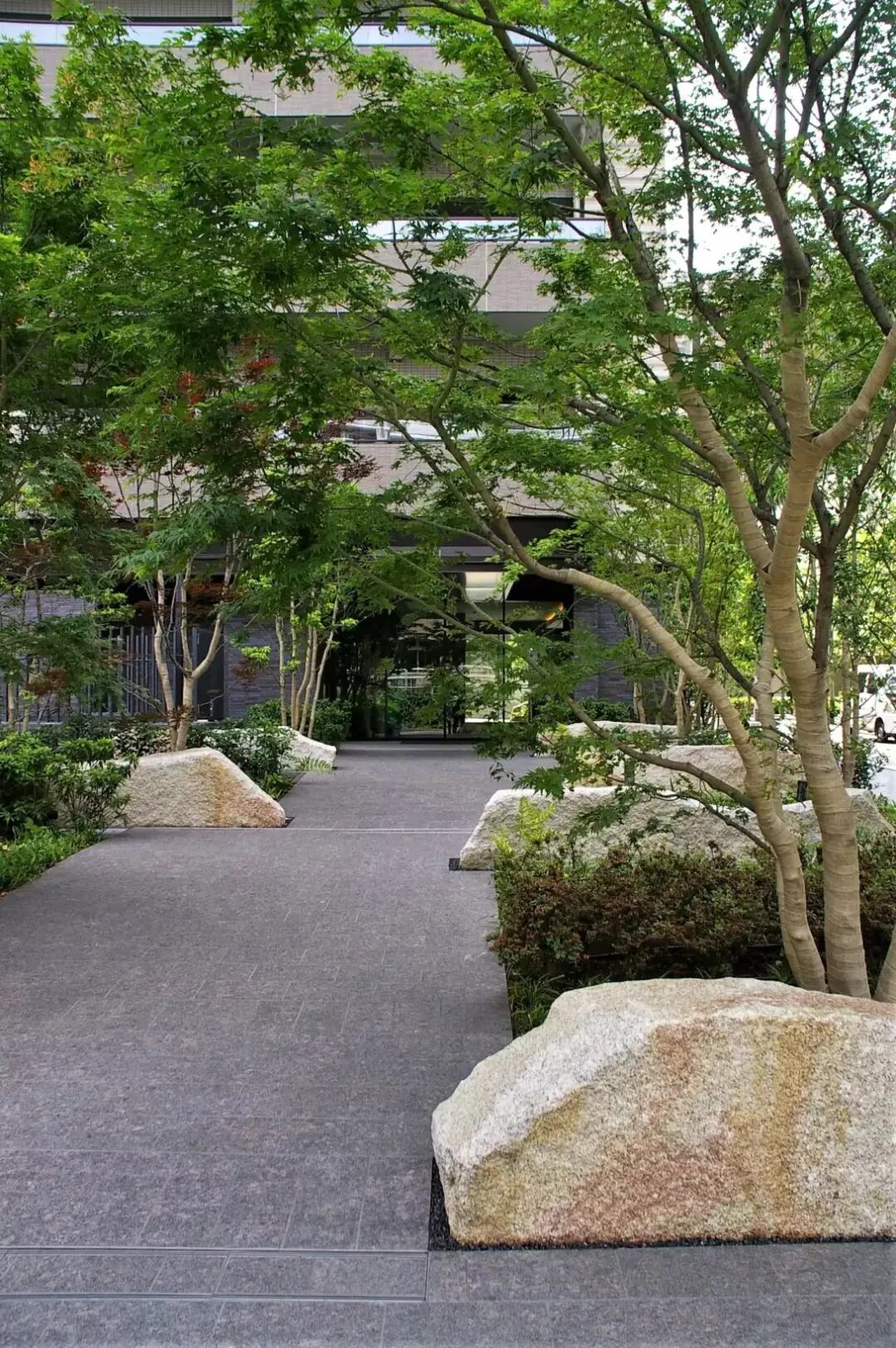 入口花园”是一个绿色的入口迎宾隧道空间。这里配置的特色自然切割石材,为入口增添进深感的同时,也演绎出了一种个性和高级感。当然同时这里也是品川区指定的一个作为人们放松休憩的公共空间,部分装饰性的石材被切割成了一条长凳,或被组合摆放勾勒出一条快捷步道。