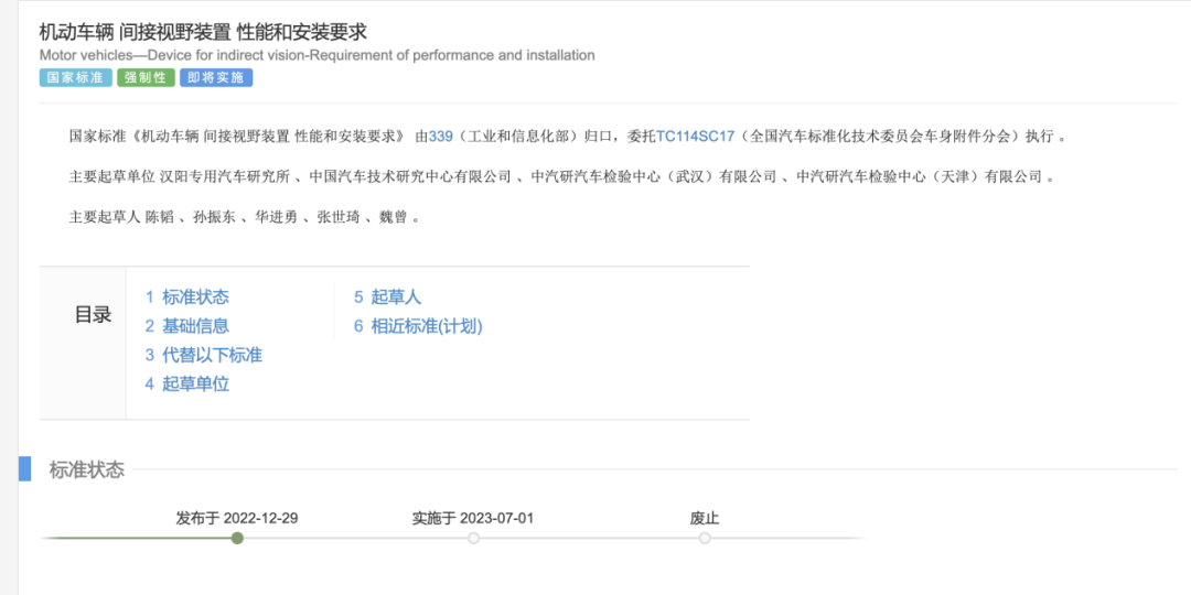 根据全国标准信息公共服务平台公开信息可知,汽车电子后视镜CMS新国标GB15084-2022将于2023年7月1日正式实施,届时将全部替代2013年发布的旧标准。