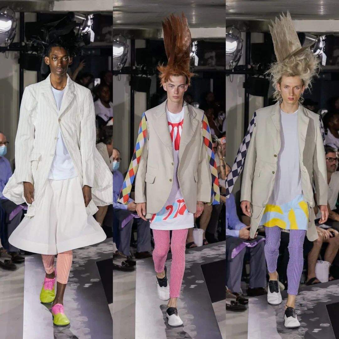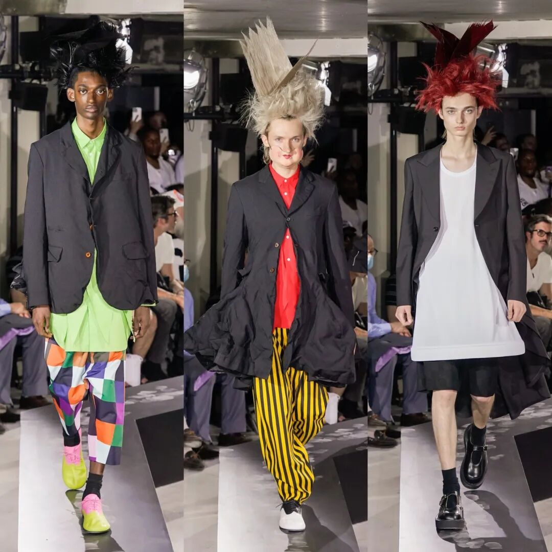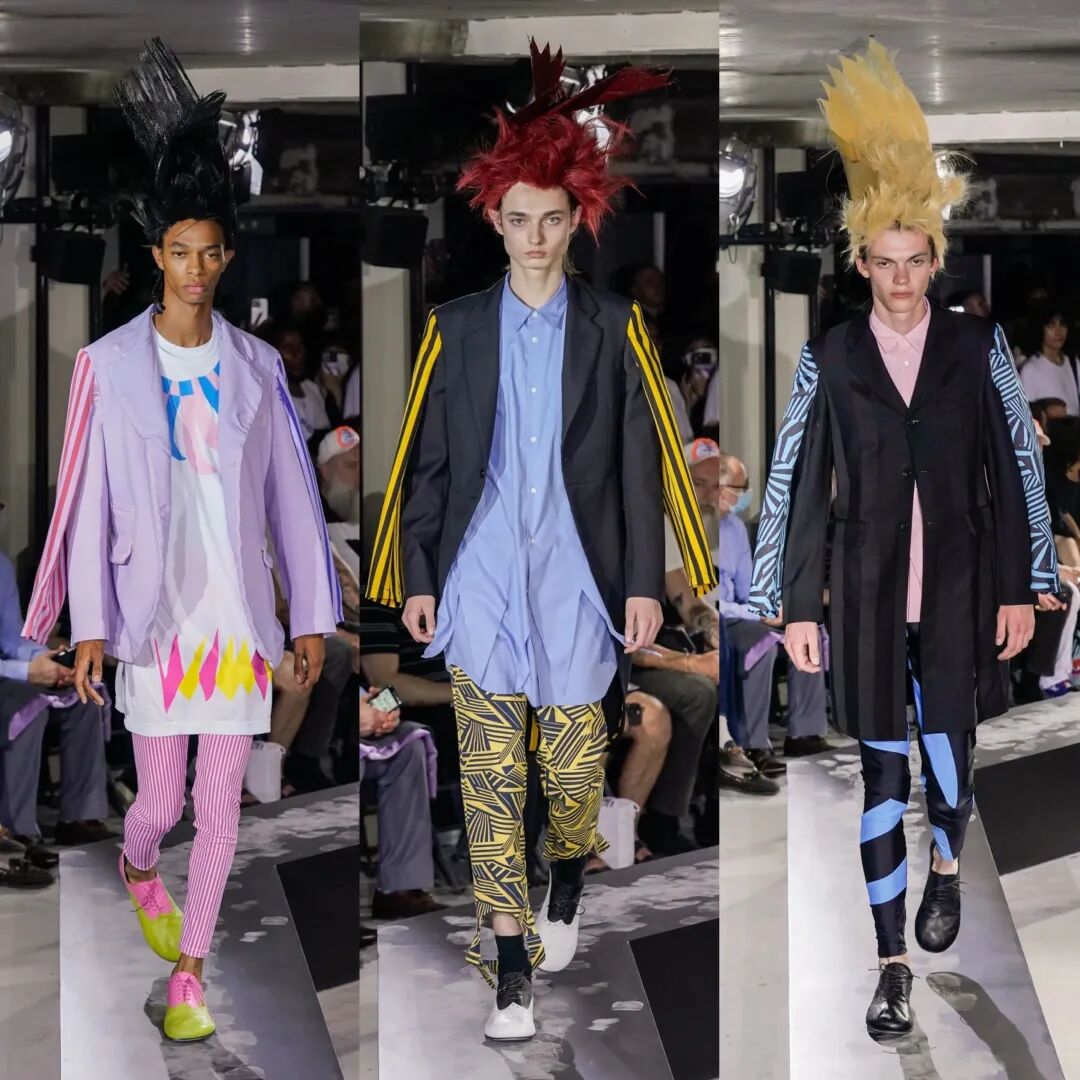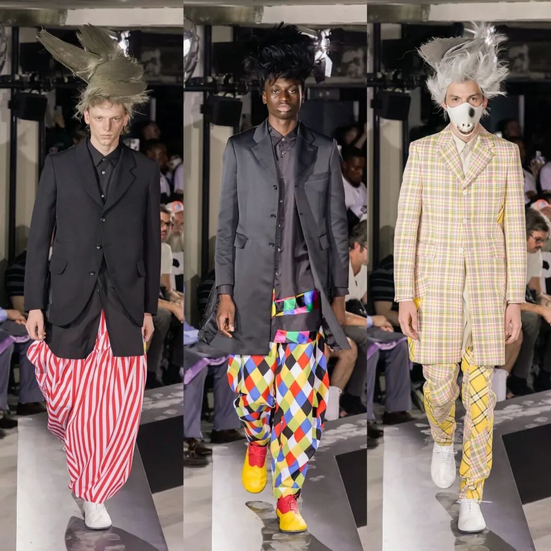 鸟窝般的发型、逗趣表情的面具、各种独特剪裁的西服外套下摆,还有鲜艳夺目的几何图形,几乎从头到脚的亮点让人目不暇接,构成了川久保玲新一季男装设计的奇思妙想。