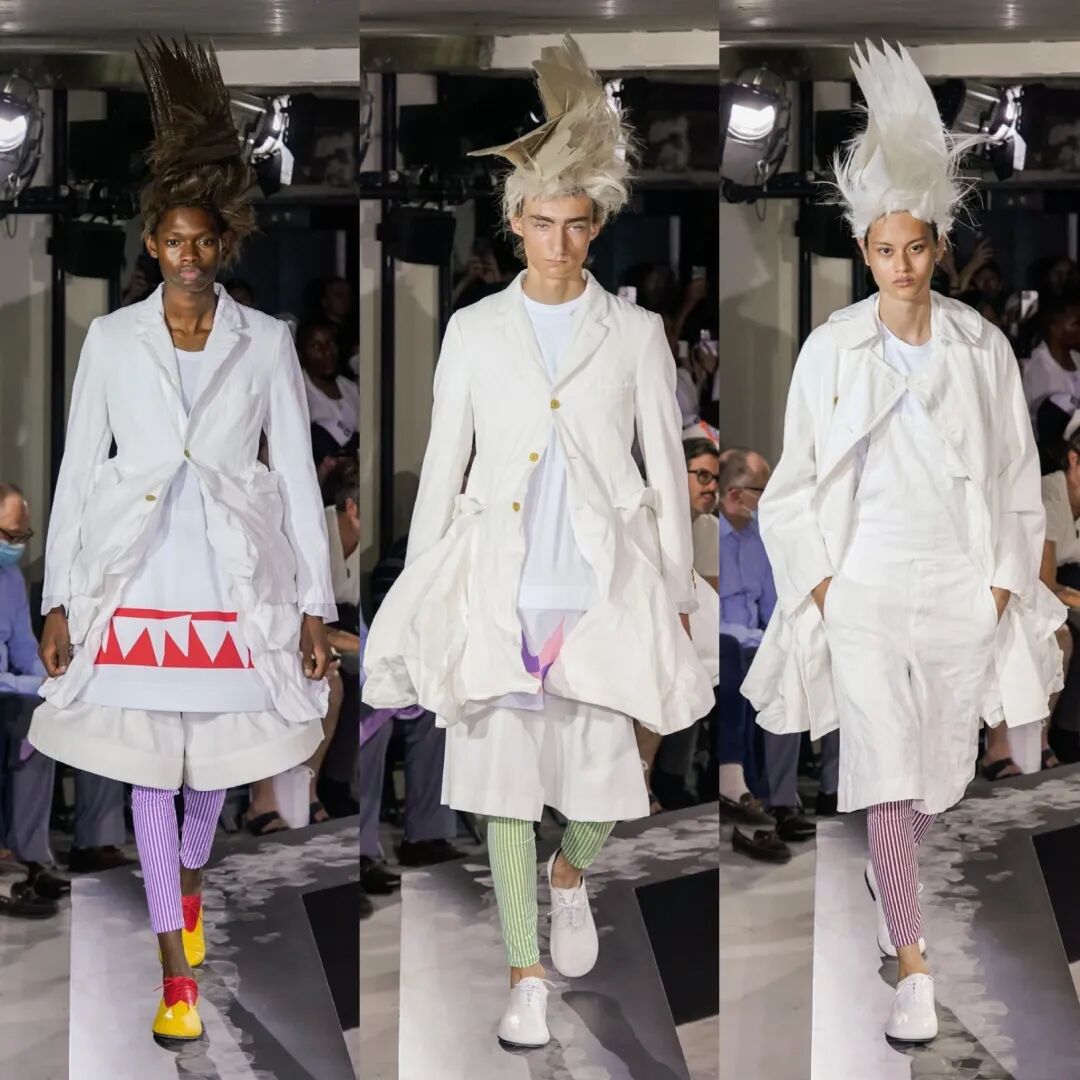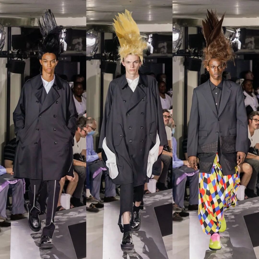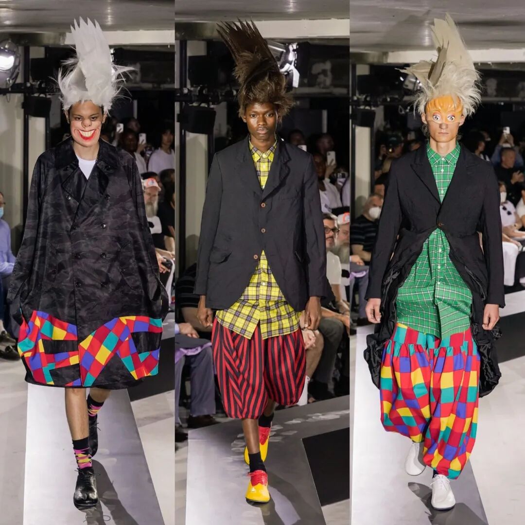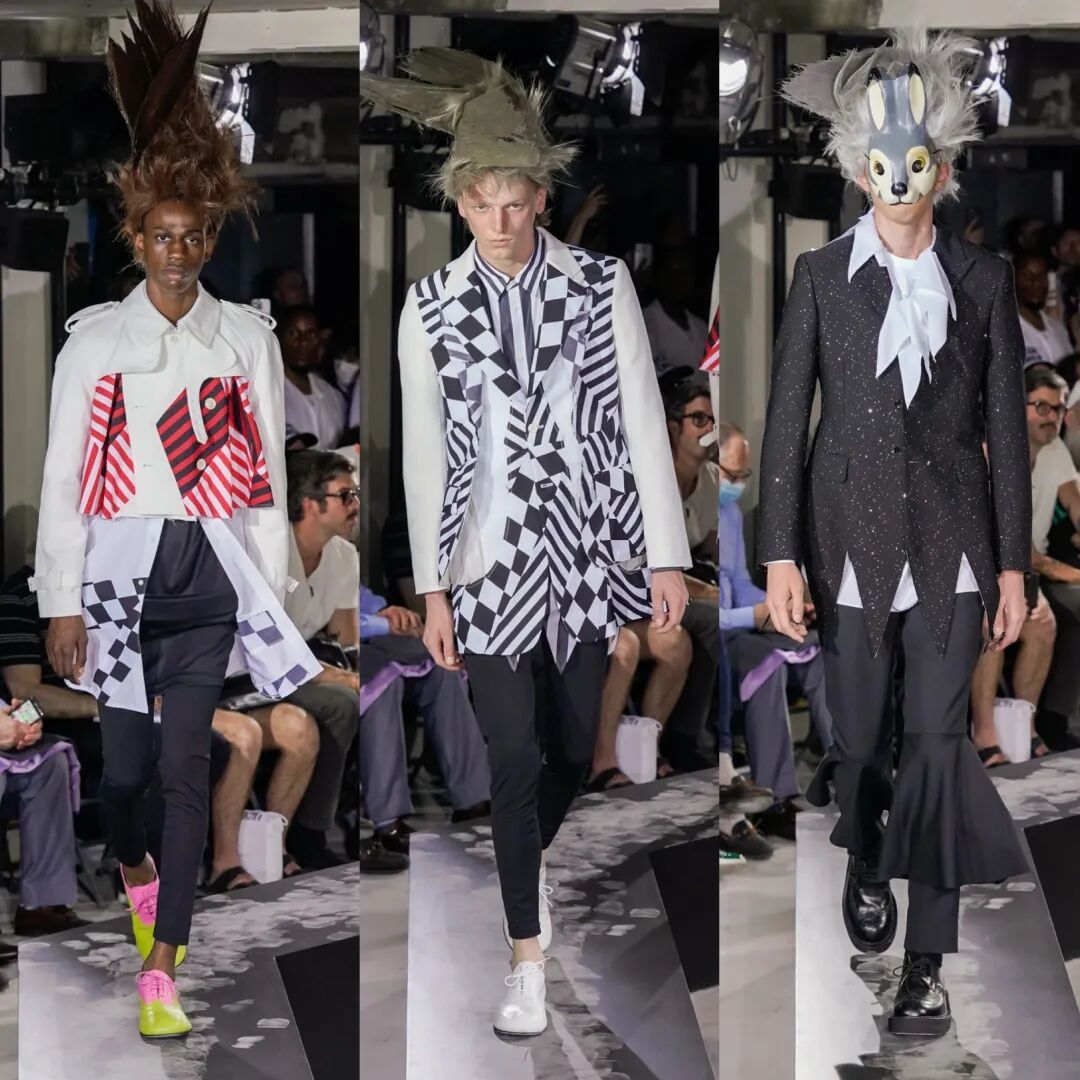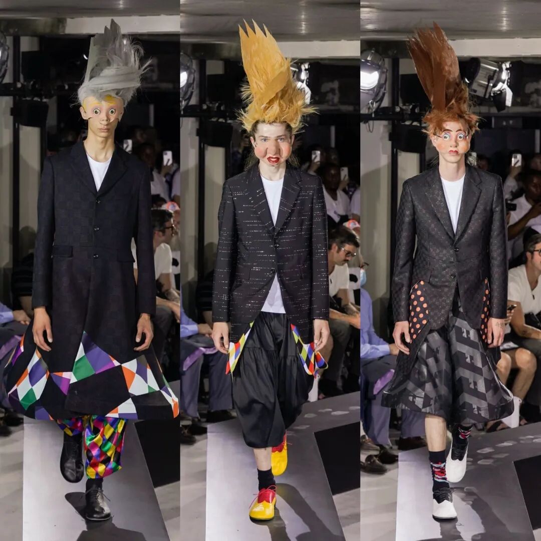 鸟窝般的发型、逗趣表情的面具、各种独特剪裁的西服外套下摆,还有鲜艳夺目的几何图形,几乎从头到脚的亮点让人目不暇接,构成了川久保玲新一季男装设计的奇思妙想。