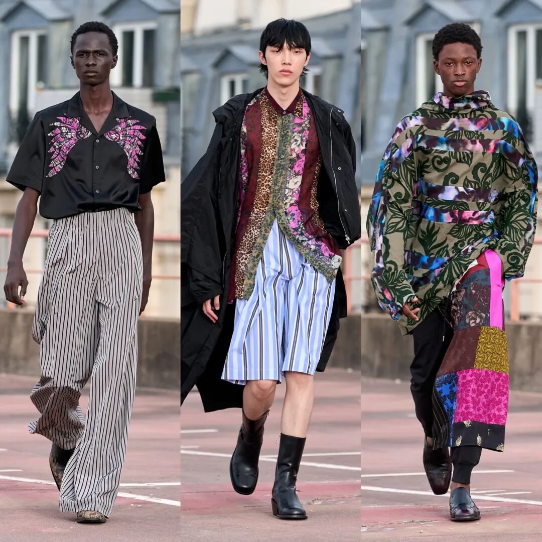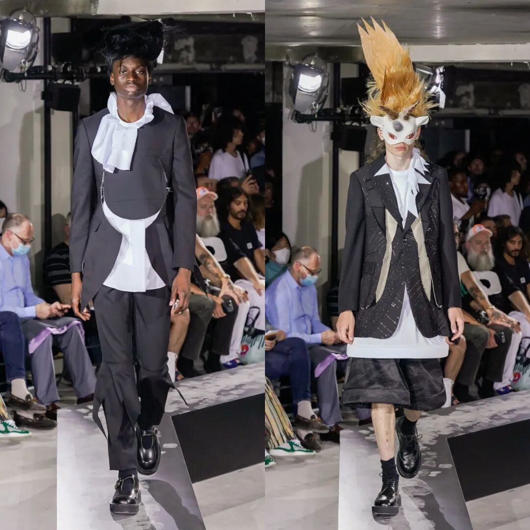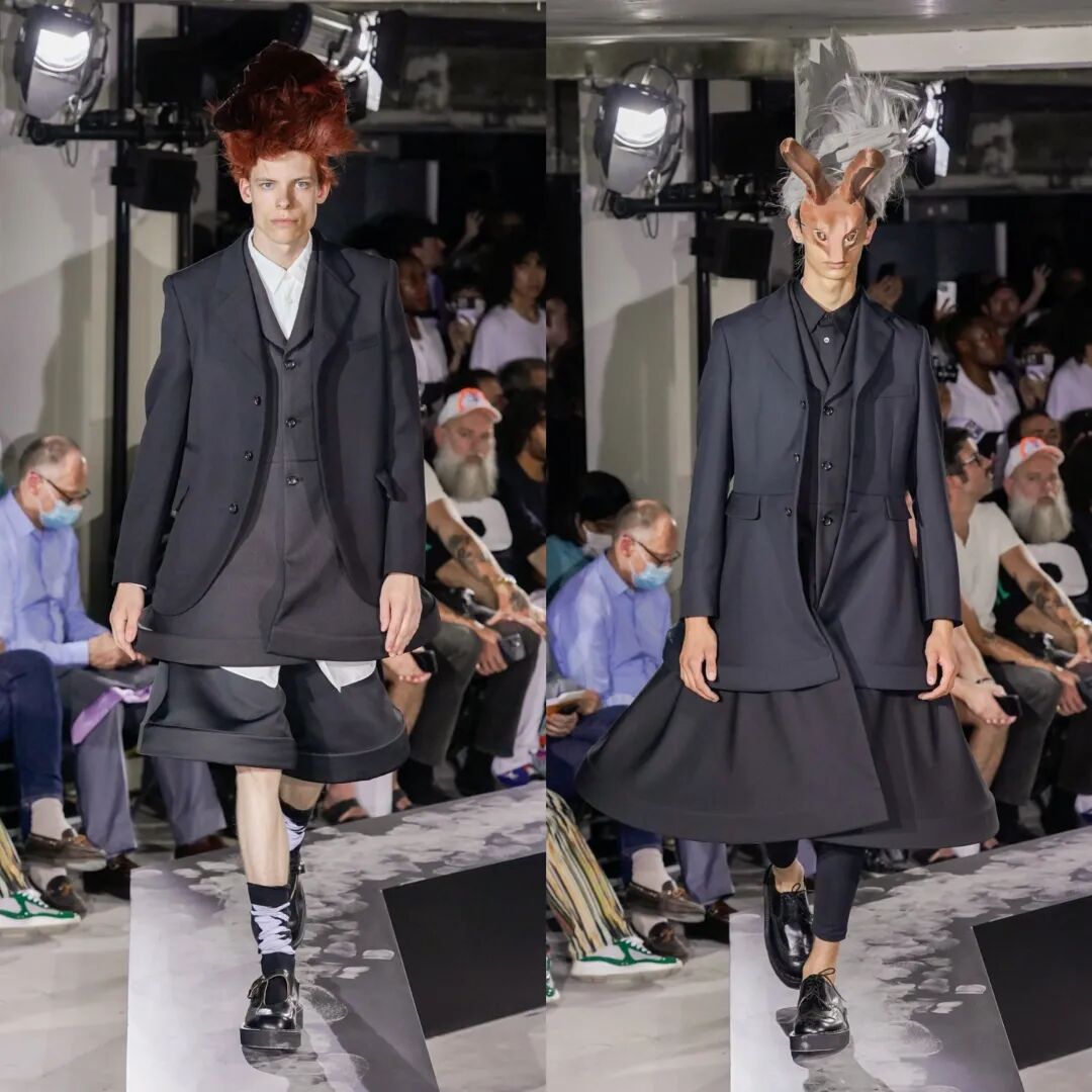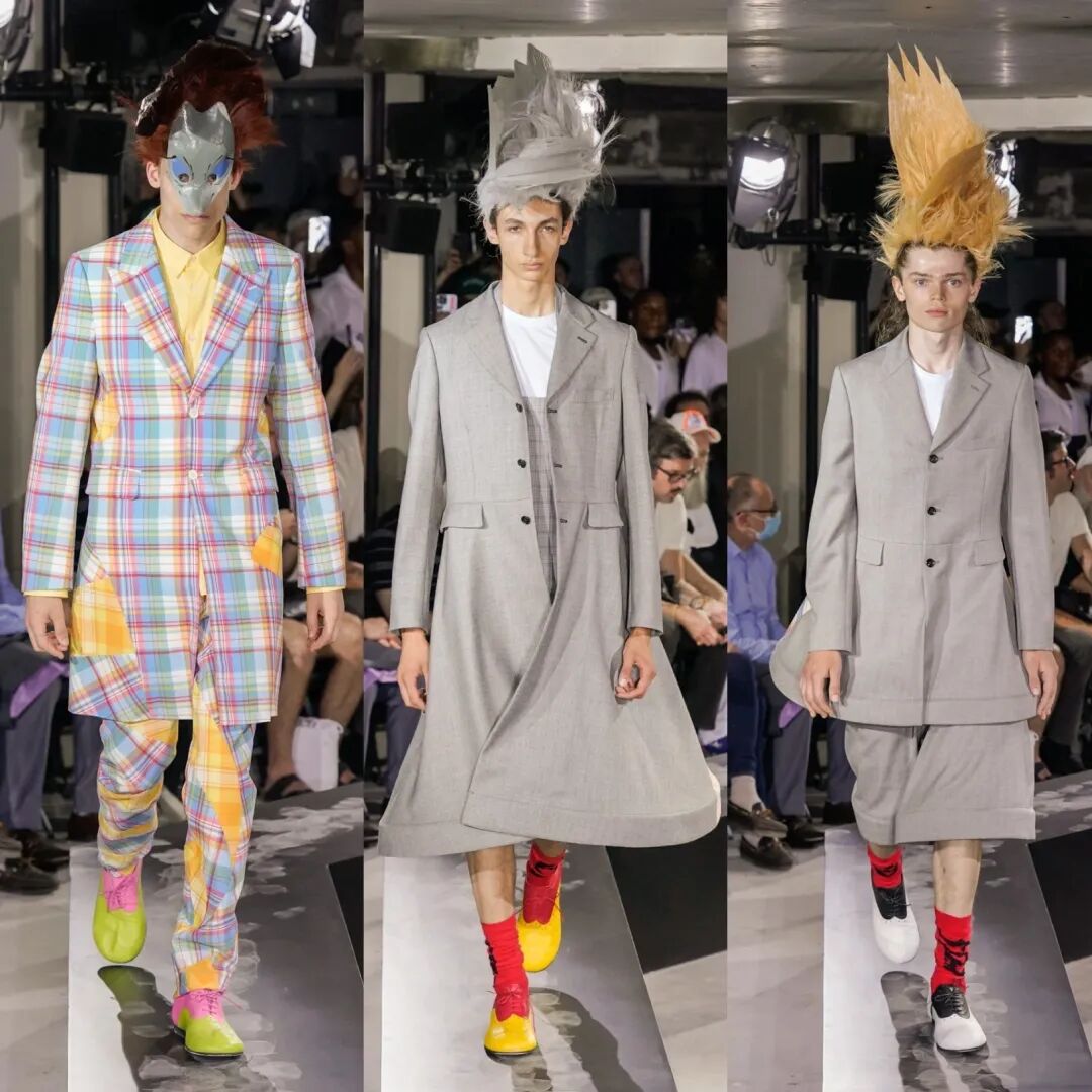 鸟窝般的发型、逗趣表情的面具、各种独特剪裁的西服外套下摆,还有鲜艳夺目的几何图形,几乎从头到脚的亮点让人目不暇接,构成了川久保玲新一季男装设计的奇思妙想。