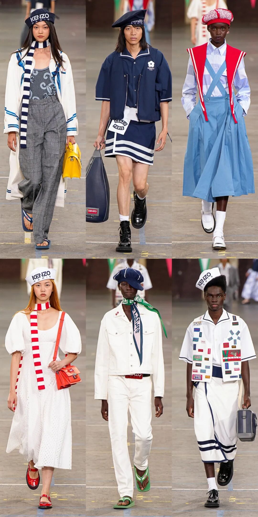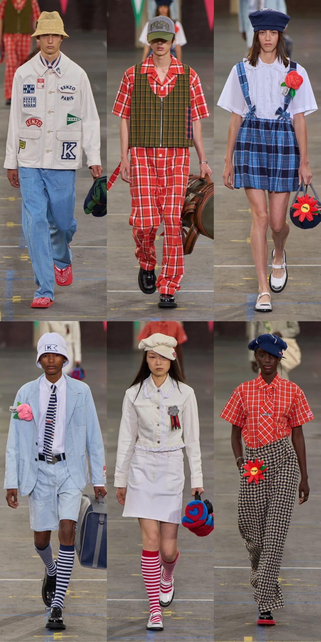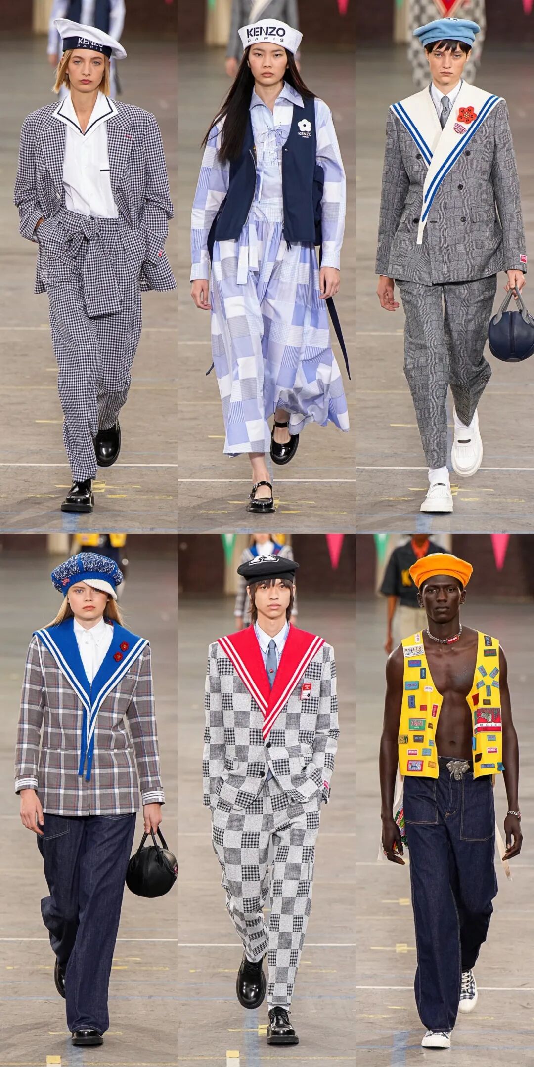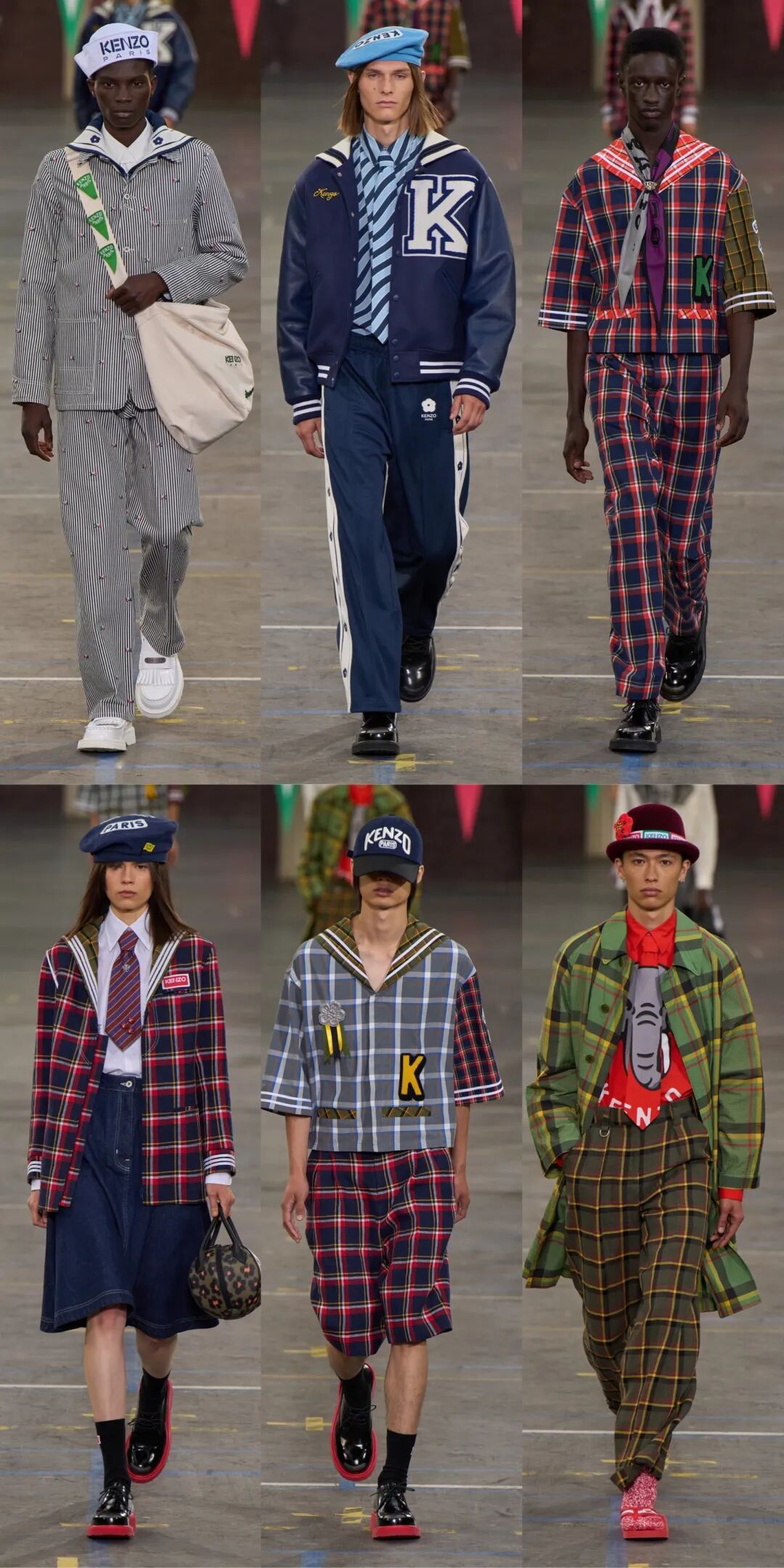 这是潮流教父 Nigo 担任 KENZO 艺术总监发布的第二个系列,欢乐的航海与校园风格贯穿整场秀,各种条纹、格纹图案与色块增添无限青春气息,花朵元素也频繁点缀其中,逐渐成为了品牌新的标志性符号。