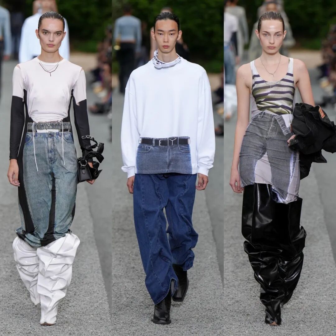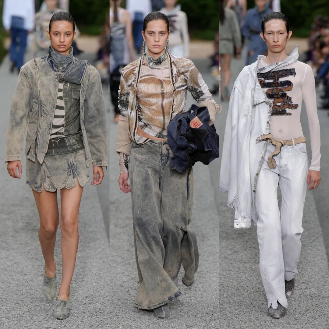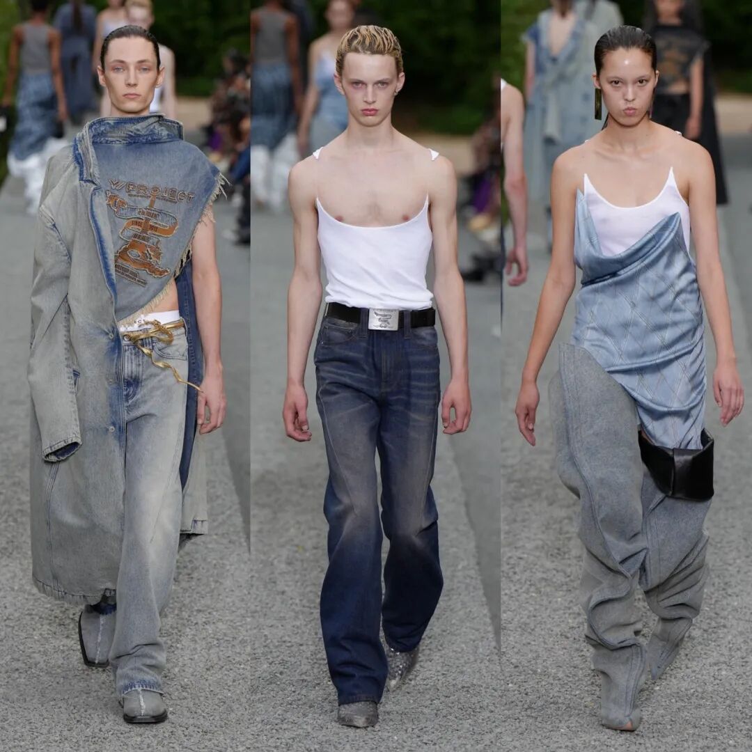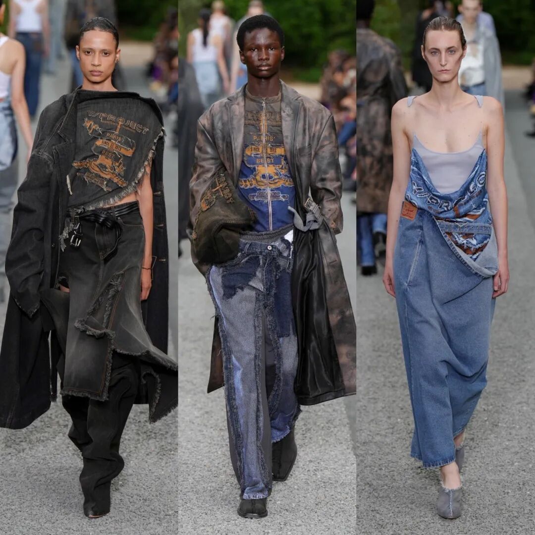 Glenn Martens 对牛仔的创新一路高歌猛进,层出不穷的设计单品新颖呈现,颠覆人们对牛仔新的期望… 本季还有超细吊带背心、仿牛仔图案印花、不规则拼接处理等细节值得留意。