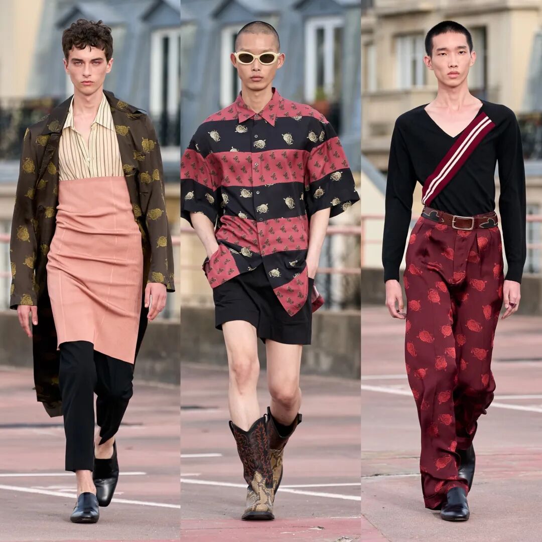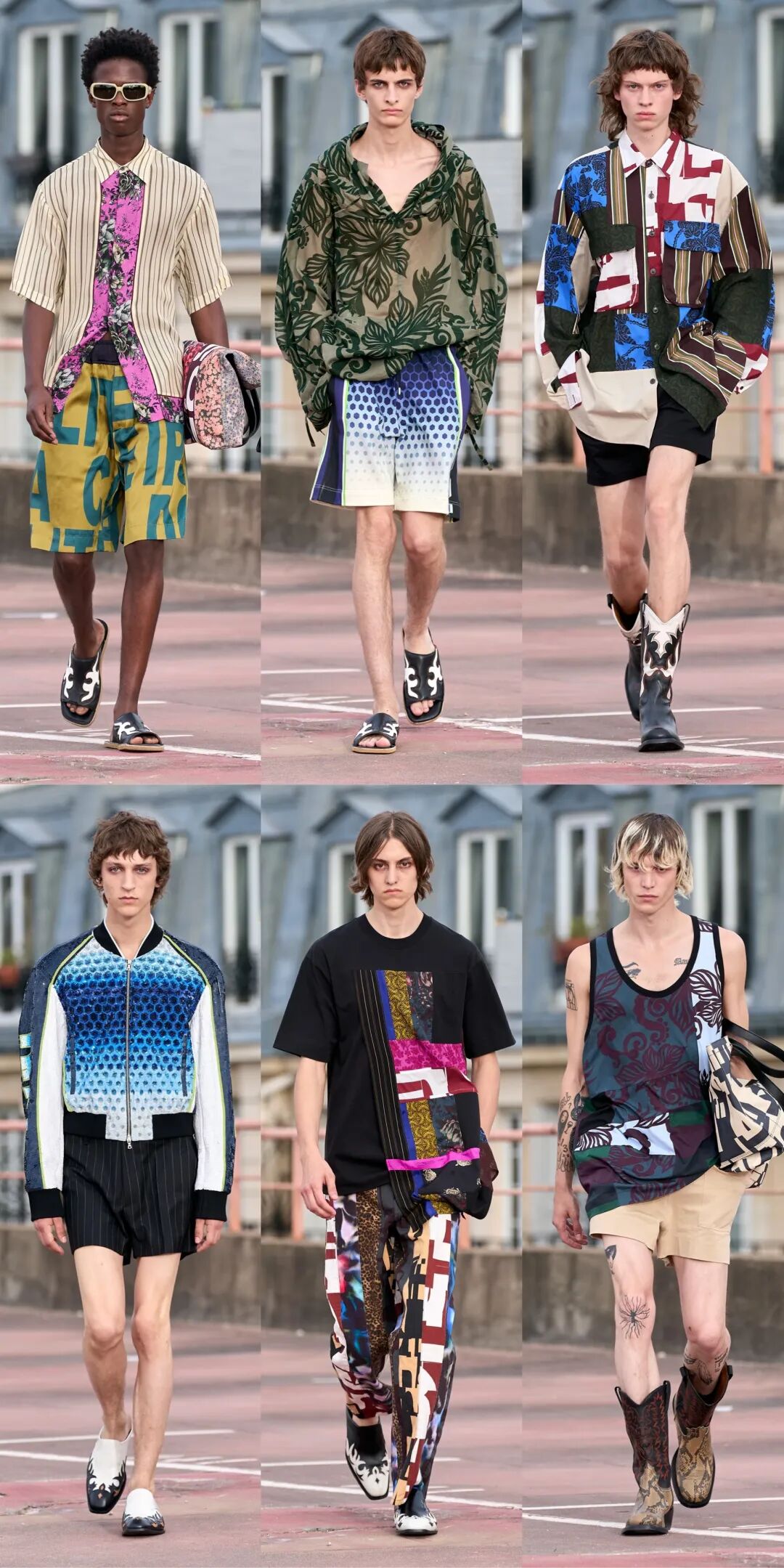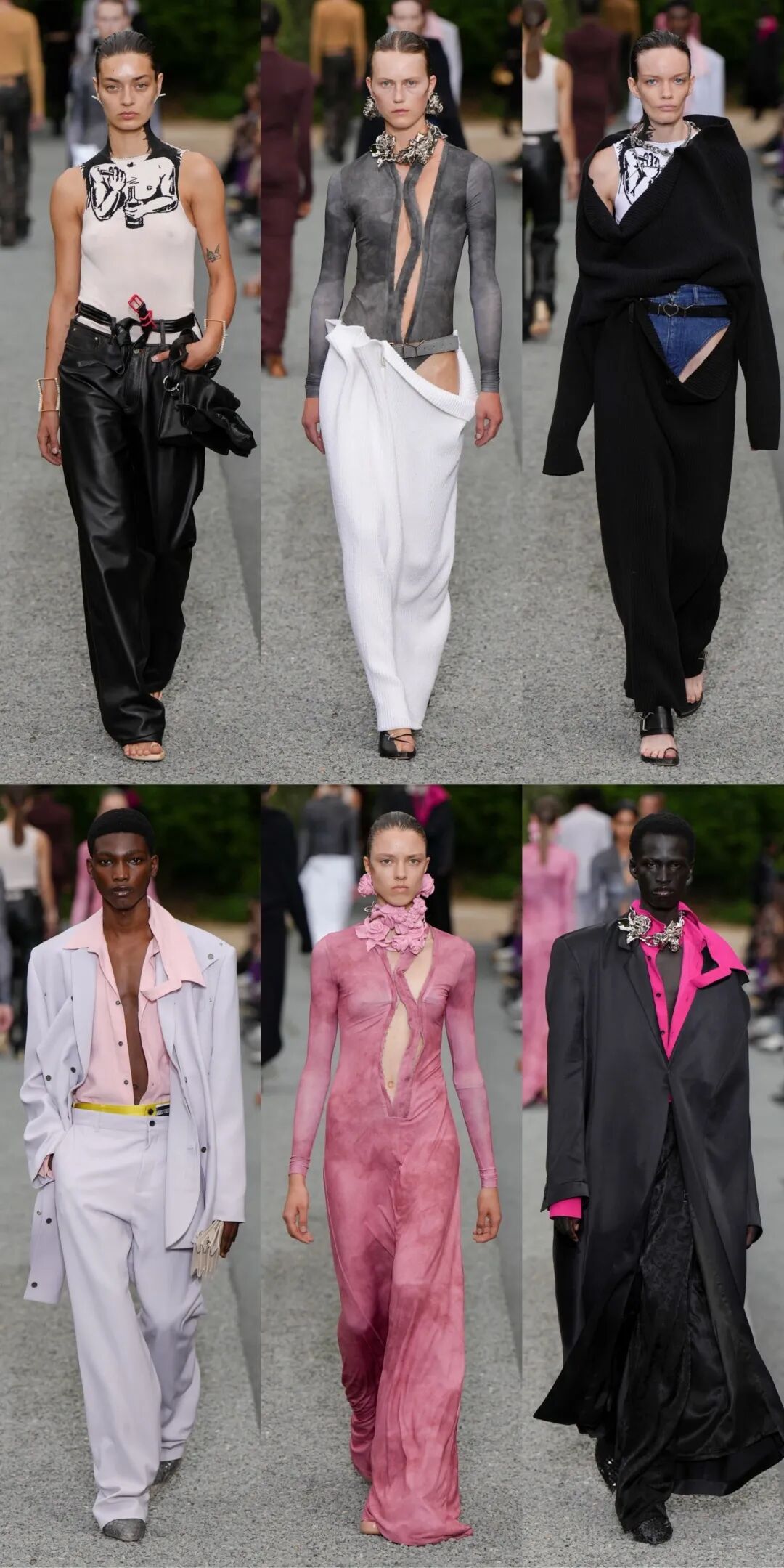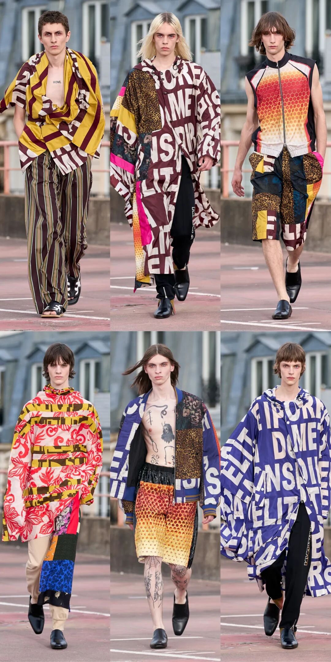 围裙、吊带衫、收窄腰线等单品与细节的出现,让整个系列蒙上了一层性别流动的色彩;各种图案面料之间的拼接,彰显了品牌独特的设计语言;还有各类醒目的印花,一如既往吸引着我们的目光。