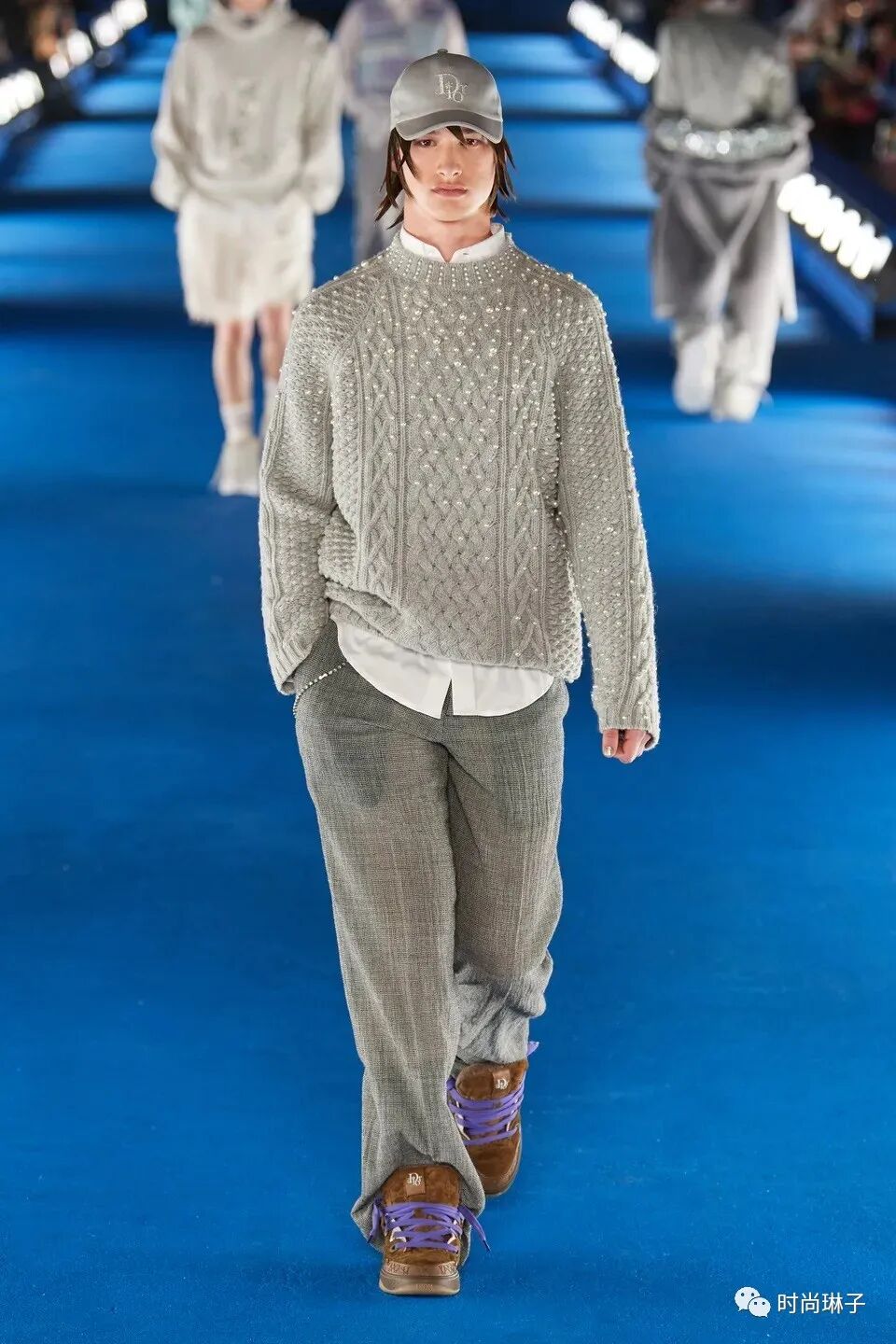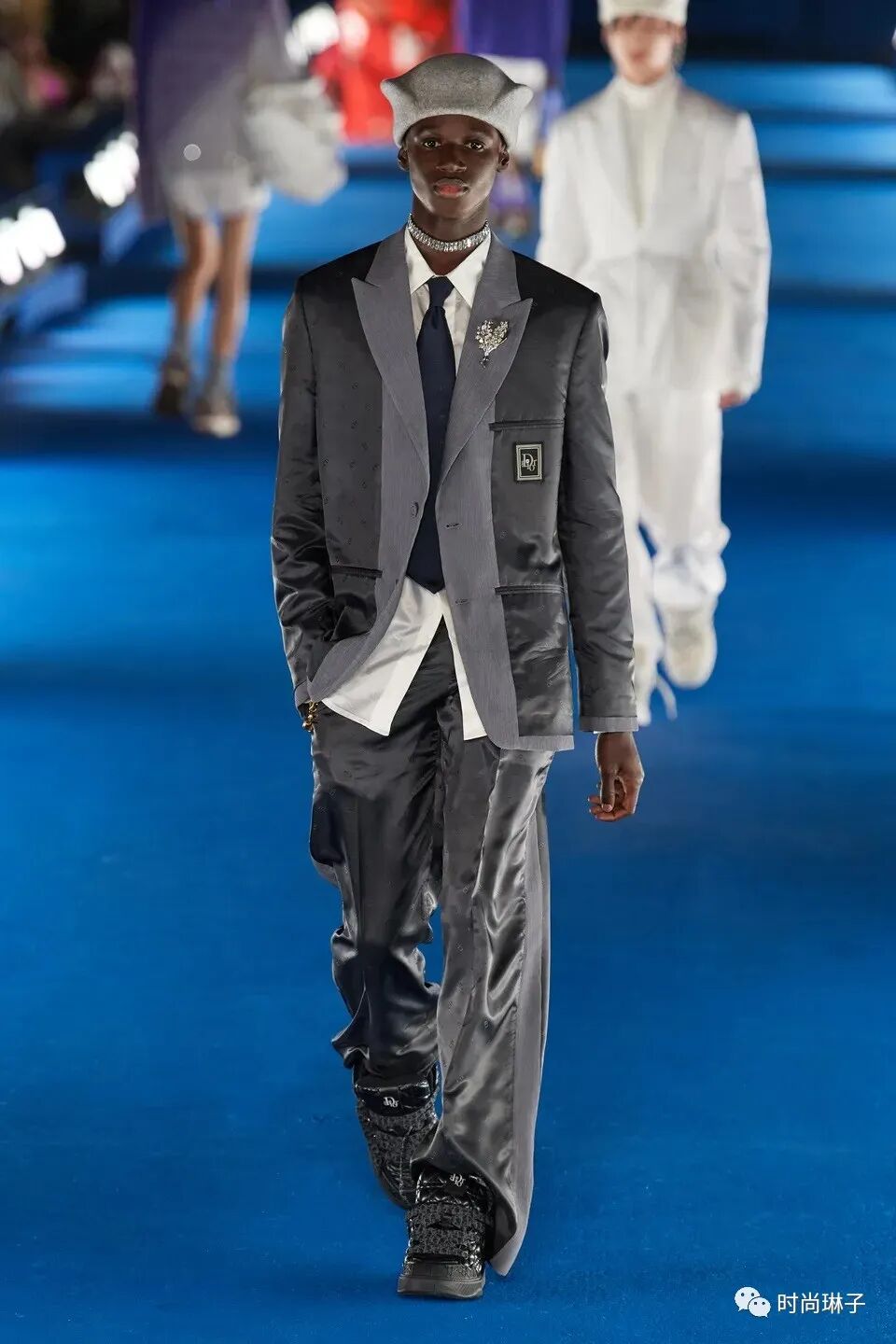 翻转内衬的西装采用经典灰配色,致敬现任艺术总监Kim Jones加入迪奥后创作的首个系列。