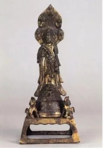 北周的金铜佛像相比前朝,发展势头已趋减弱,但也不乏精美之作。日本东京艺术大学艺术资料馆就藏有一尊铜鎏金菩萨像,是这一时期的代表作。其头戴高冠,顶嵌宝珠,冠旁缯带垂肩,面相丰腴,嘴角略上翘,含有笑意,体躯俊健,胸前满饰串珠璎珞,制作十分精细。整个形象如贵妇气派,珠光宝气,极为动人。如此精湛的北周菩萨像,恐怕仅此一例!因此,有人怀疑它是入隋以后得作品。但它上承西魏之婉丽,毕竟不类入隋之润媚,而且形体丰腴亦与隋像的挺腹曲体不同,故应视之为北周作品。