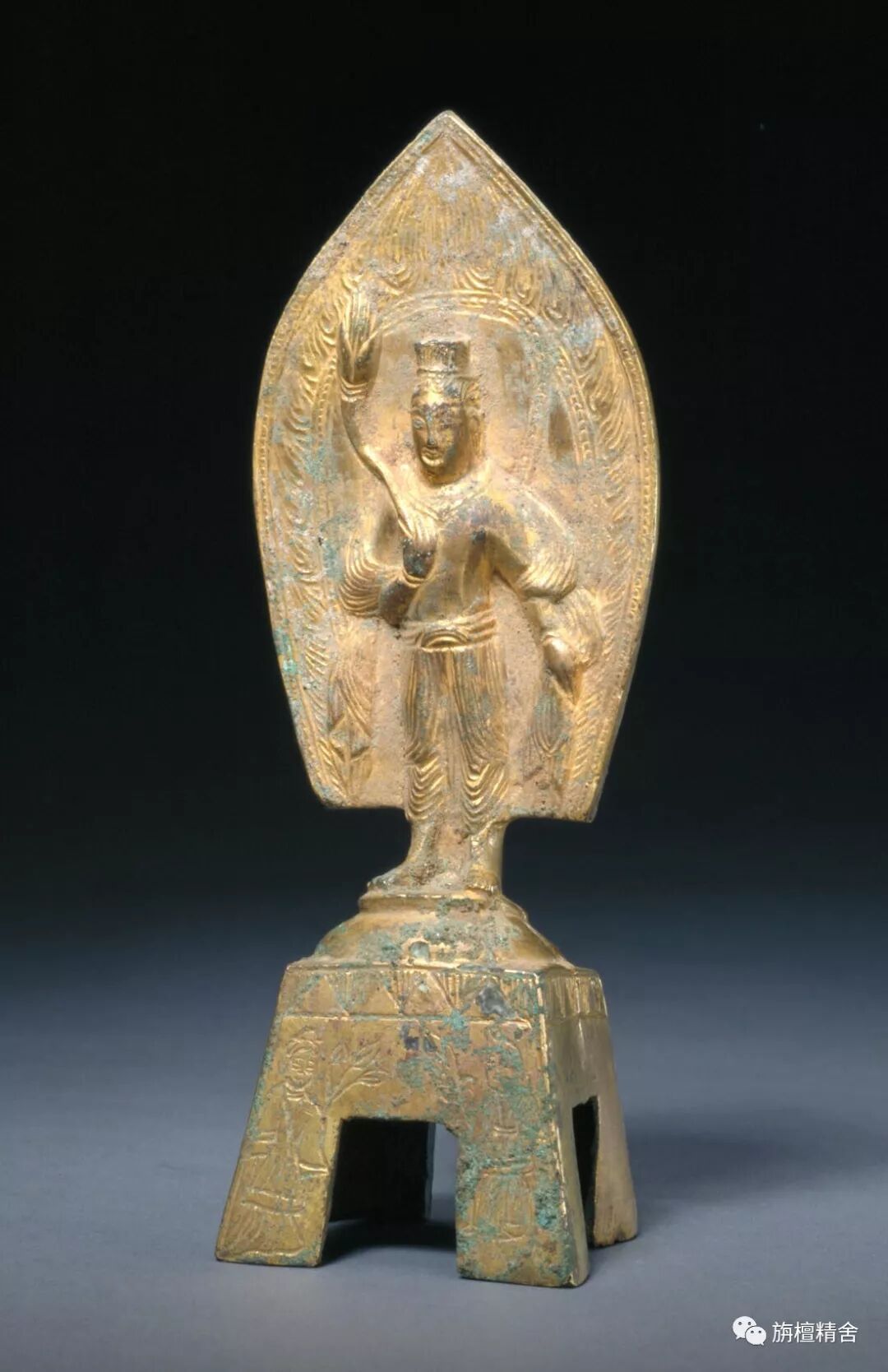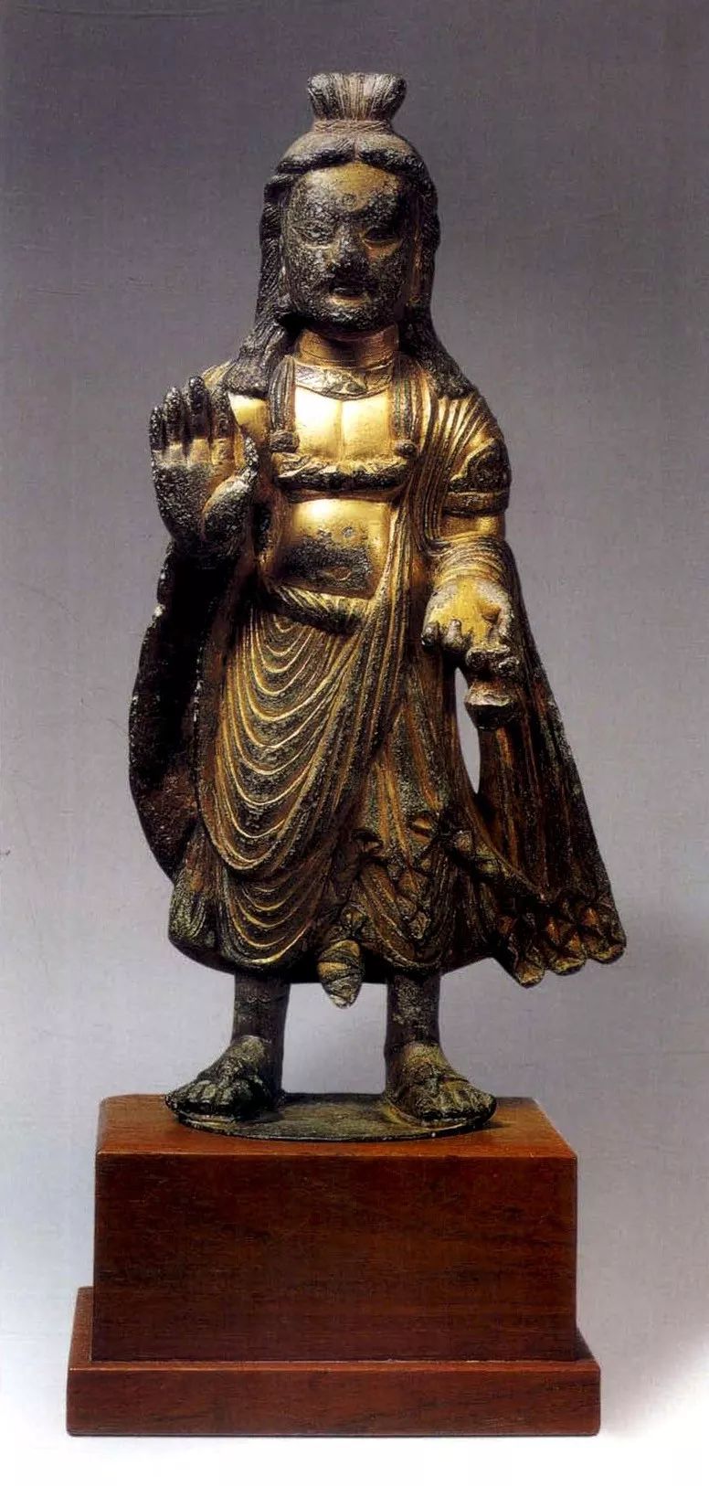 西魏时期的佛像,是在沿袭北魏晚期“秀骨清像”的基础上又有新的变化:既保持了原有的身材清俊,衣着飘逸,又融合更为生活化的艺术情趣。人物表情丰富,风度潇洒,这在麦积山石窟塑像中表现得最为充分。传世的一些单体佛像,虽然没有像麦积山塑像表现得如此强烈,但依然显露出这一鲜明的时代特征。