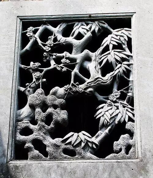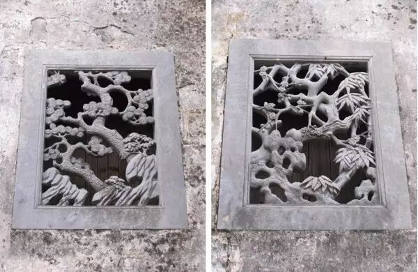 “松石图”漏窗上,两株奇松斜立于嶙峋怪石之上,十分刚劲有力。“竹梅图”漏窗上,弯竹梅影,婀娜多姿,静中有动,画中有诗。