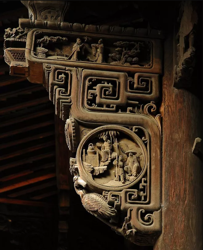 特别在建筑雕刻艺术的综合运用上,徽州人融石雕、砖雕、木雕为一体,使整个建筑精美如诗,温婉内敛,融古雅、简洁、富丽为一体,至今仍保持着独有的艺术风采,被人称之为“徽式三雕”。