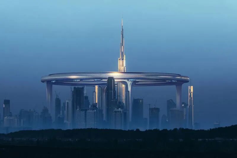 设计的高度将与世界上最高的建筑物「哈利法塔」低一些,但能覆盖迪拜大部分的建筑物,这样的设想是能重塑迪拜的天际线,另外大跨度的圆形有 3000 米的周长,只有五根柱体支撑,真不知道伸缩缝怎么留了!