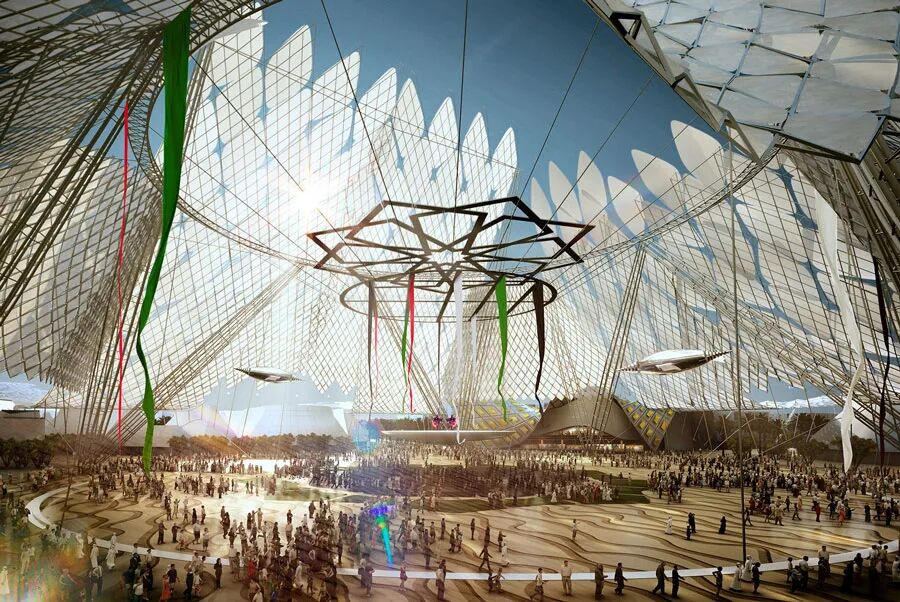 The design features three pavilions symbolizing opportunity, sustainability and mobility. These three zones emanate from a central plaza named the Al Wasl, the historic Arab name for Dubai meaning “the connection.” Inspired by the layout of a traditional Arabic “souk,” or marketplace, the design places larger pavilions on the perimeter while smaller exhibit spaces cluster toward the center to aid pedestrian flow and interaction.
