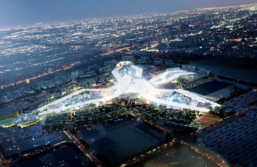 该设计有三个展馆,象征着机遇、可持续性和流动性。这三个区域源自一个名为Al Wasl的中心广场,它是迪拜的阿拉伯语历史名称, 意为“连接”。设计灵感来源于传统阿拉伯“露天市场”的布局,在周边设置了较大的展馆,而较小的展览空间则向中心聚集,以帮助行人流动和互动。