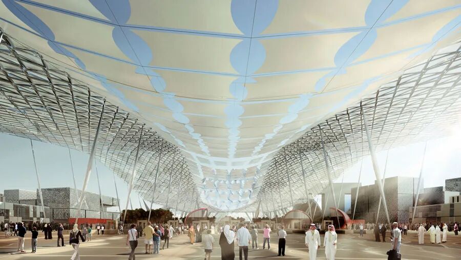 The team planned the Expo site to serve as a sustainable benchmark for events in the Middle East. A photovoltaic fabric structure covers the main walkways, acting as a solar-powered sun shade and combining with photovoltaic panels on building facades to capture enough sunlight to generate at least half of the Expo’s energy requirements. Other sustainable strategies include recycling wastewater, reusing materials and monitoring the Expo’s carbon footprint. The plan ensures that the site and many of the structures can transition into being part of the city’s fabric after the event.