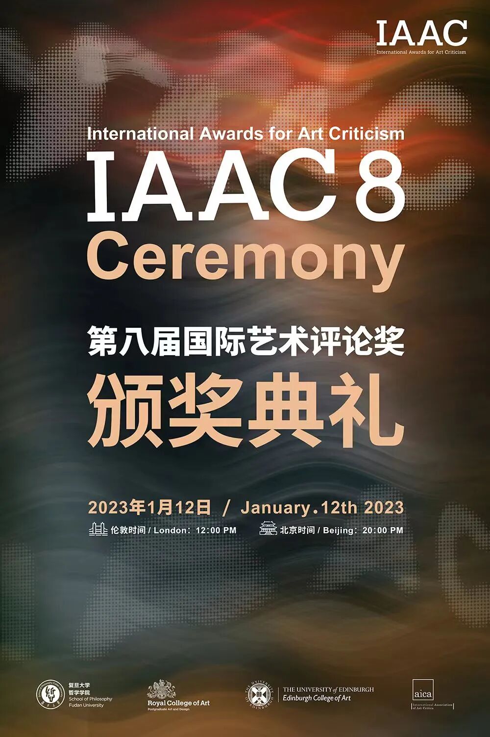 第八届国际艺术评论奖(IAAC)由国际艺术评论奖组委会与复旦大学哲学学院主办,英国皇家艺术学院、爱丁堡艺术学院、国际艺术评论协会协办,旨在推动当代艺术的独立评论,汇集中、英两国乃至世界范围内的优秀评论,并促进艺术评论者的批判性思考、对话和研究。