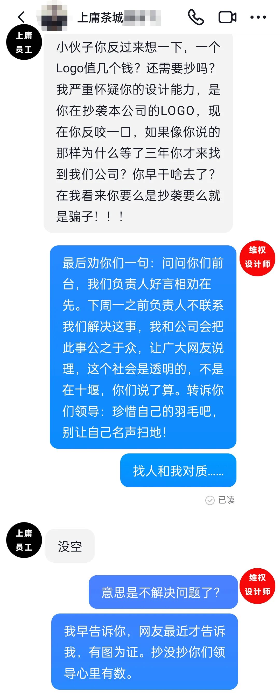 第二天,logo设计师发现上庸员工抖音上出现我们的logo,前往说理。遭到员工的抨击。