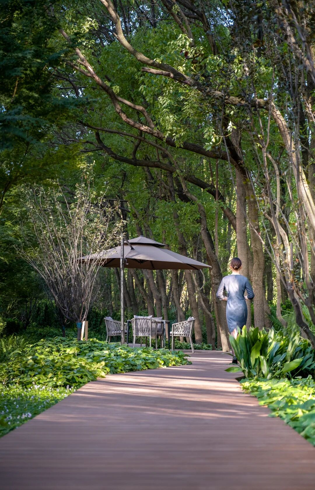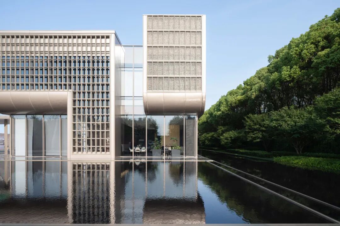 ▲水天一色:建筑坐落在水镜之上,与景墙围合出方正的空间格局,植物在水中倒映出笔直的树干,给人以大气舒朗的感受。