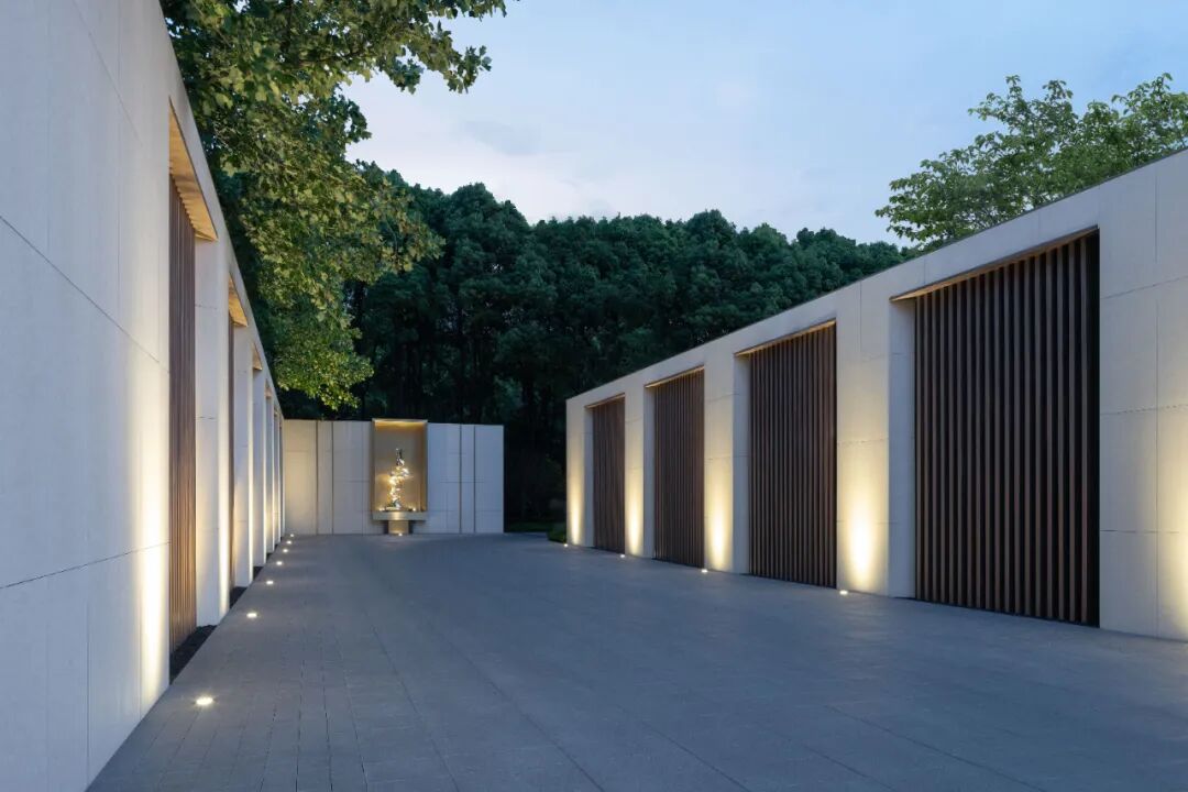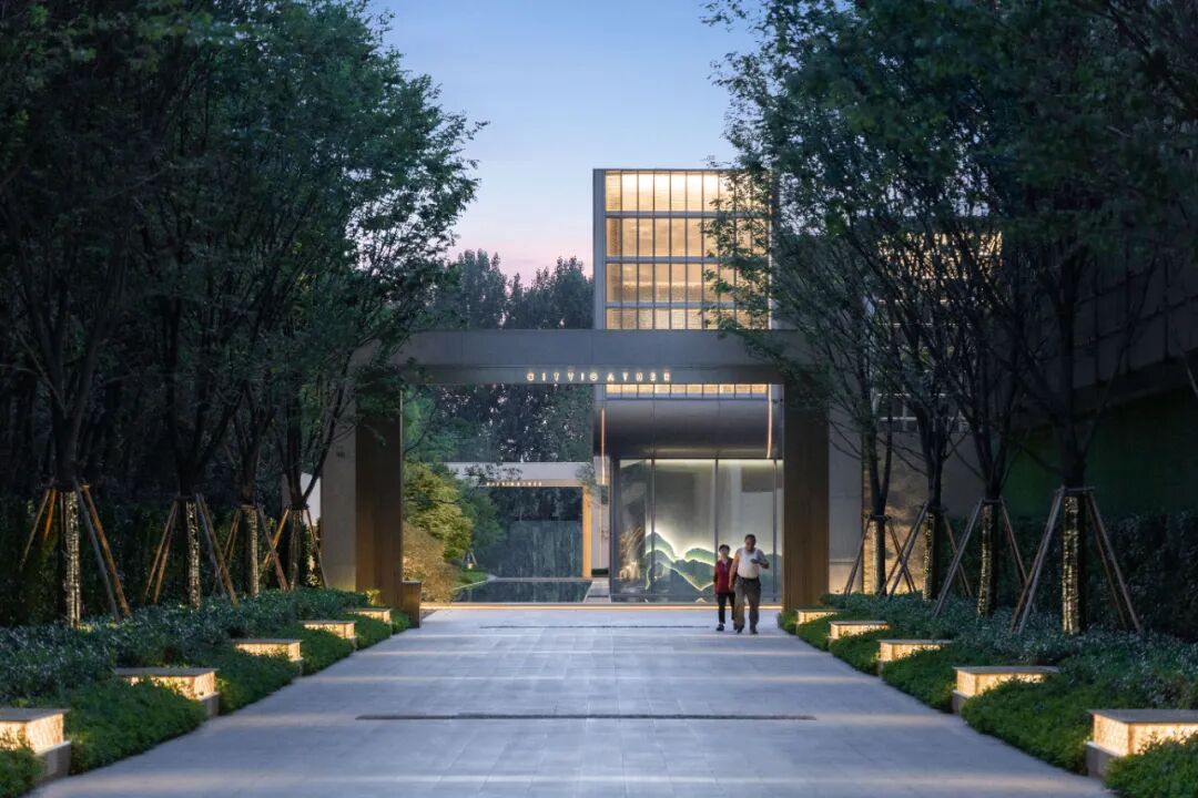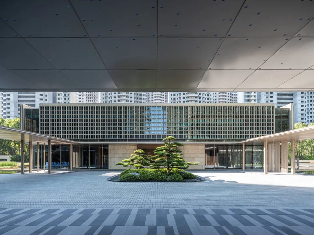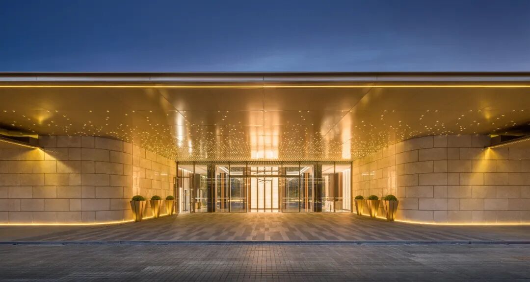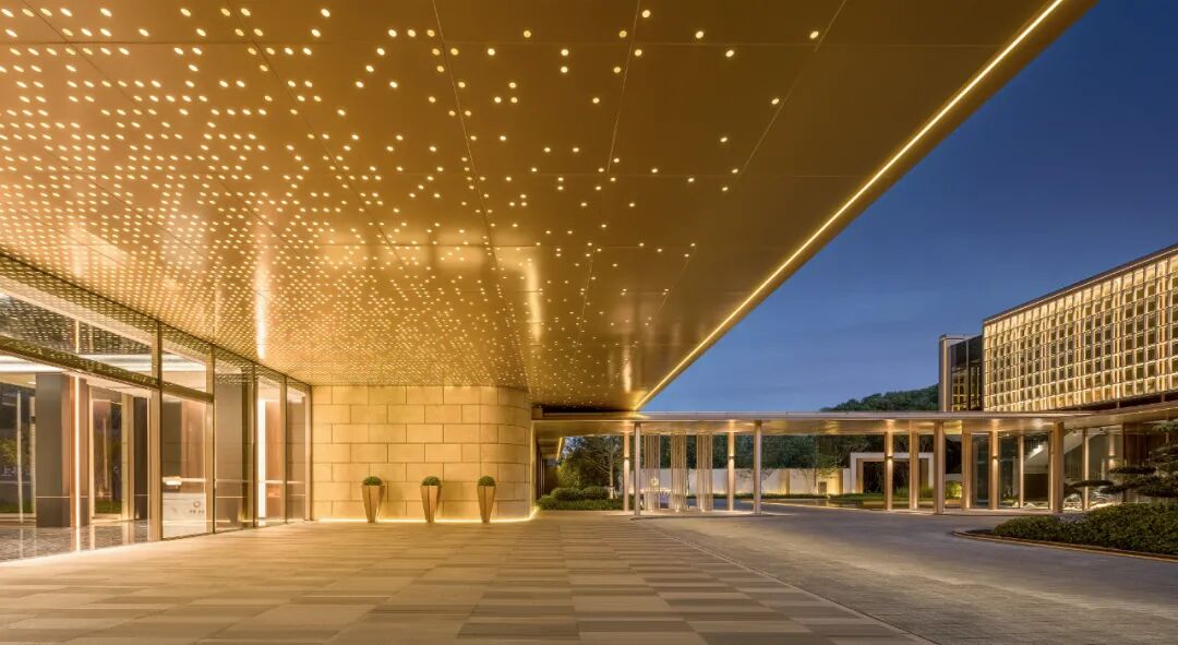 When you enter the hotel style drop off area, the surrounding corridors and the metal color materials and arc elements of the building create a sense of dignity and atmosphere. The characteristic metal screen is half covered and half leaked, echoing the architectural elements.