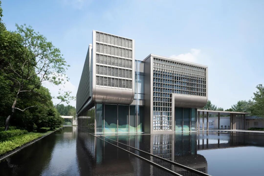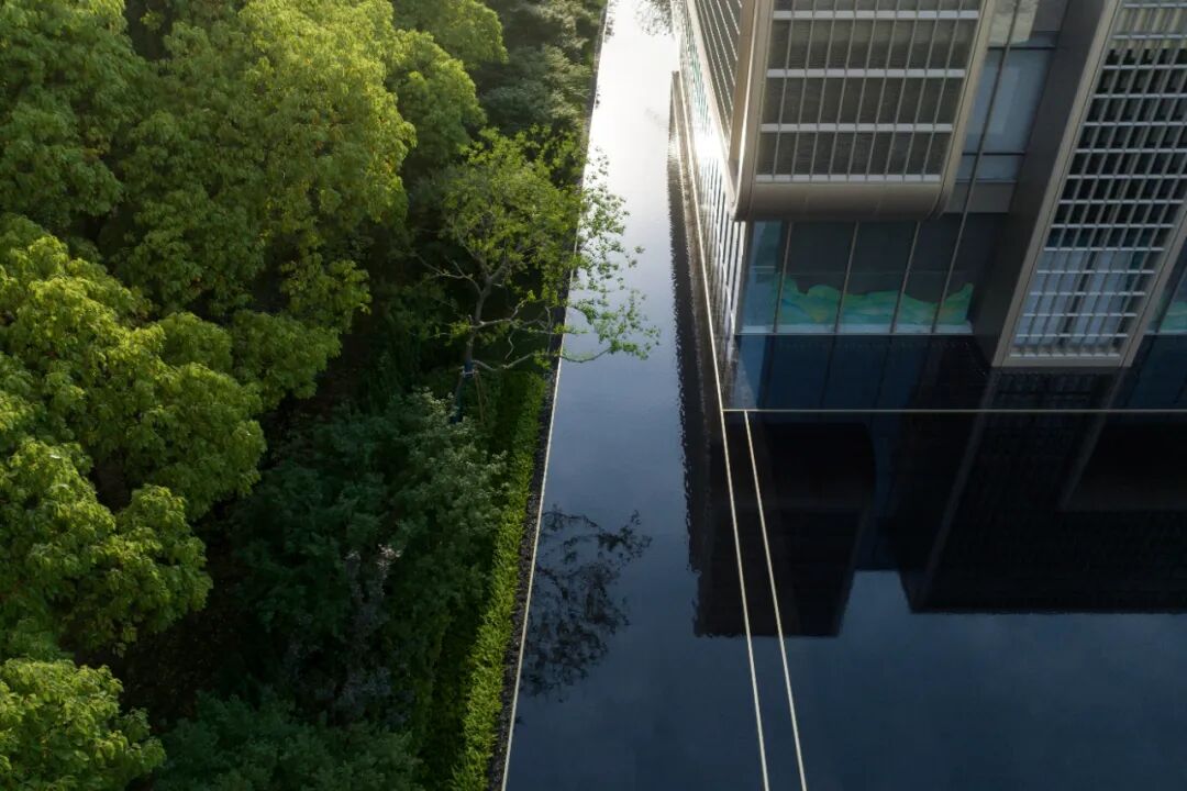 Water and sky: the building is located on the water mirror, which creates a square spatial pattern with the landscape wall. The plants reflect straight tree trunks in the water, giving people a feeling of atmospheric and comfortable.