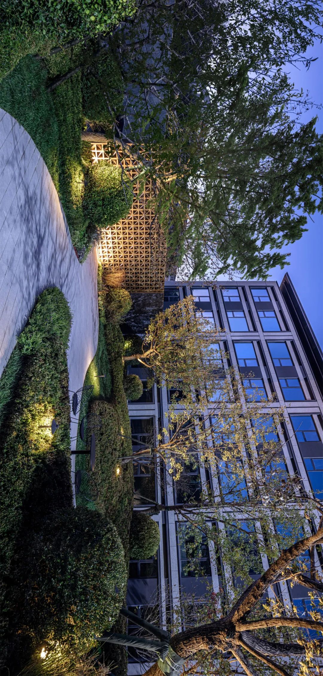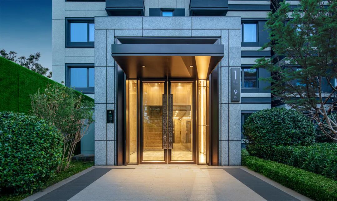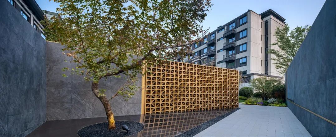 异形的入口格局,搭配金属透光格栅,虚实结合,阻隔了城市的嘈杂和浮躁,富有肌理感的深色石材,延展出一幅自然生趣、隐奢典雅的自然画卷。