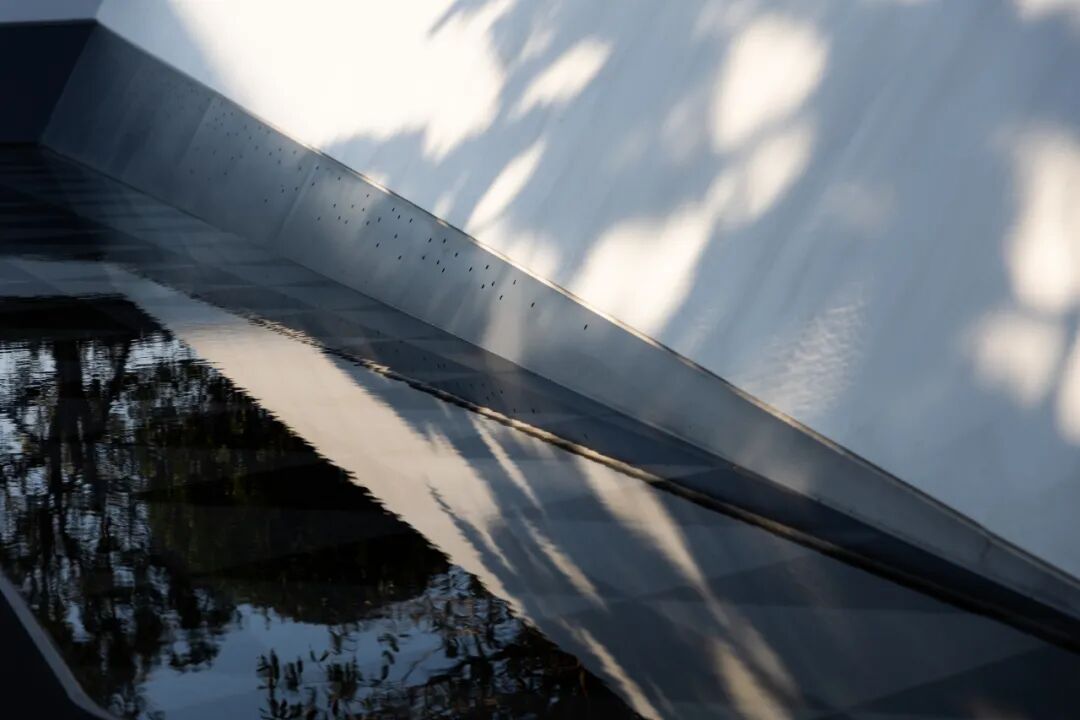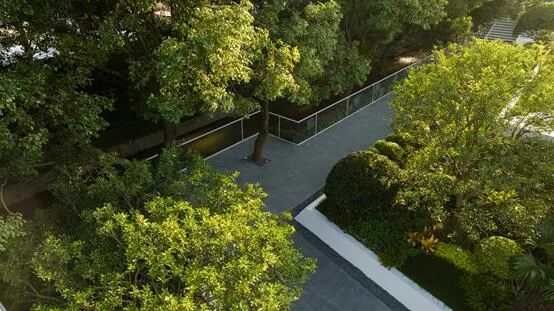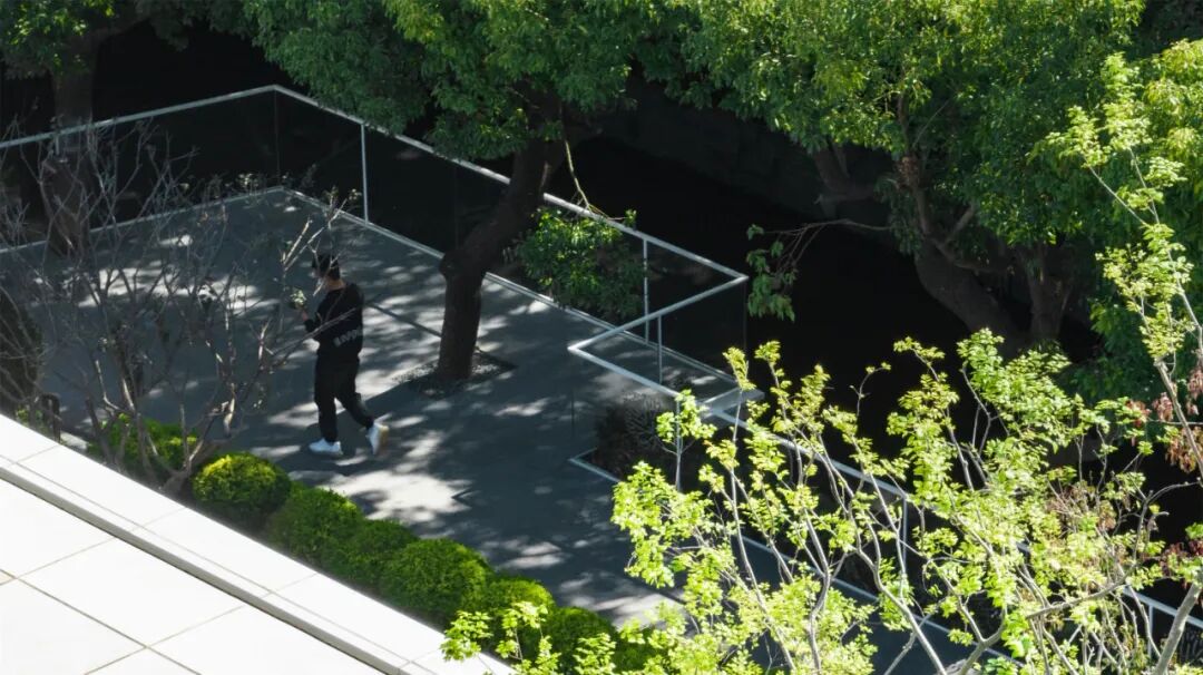平静水面倒映着内部层叠的空间布局,周边优雅舒展的树冠,自然环境中的阳光、树木、花草、流水跟建筑空间默契共存。