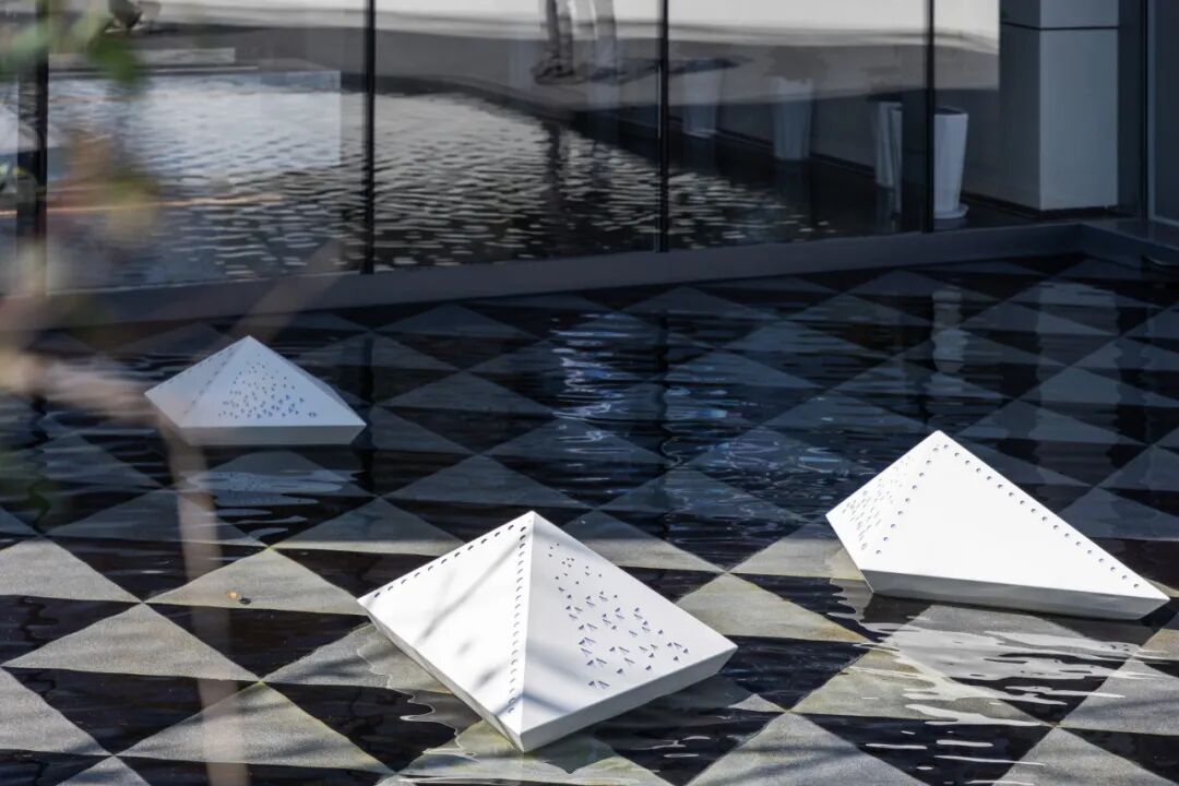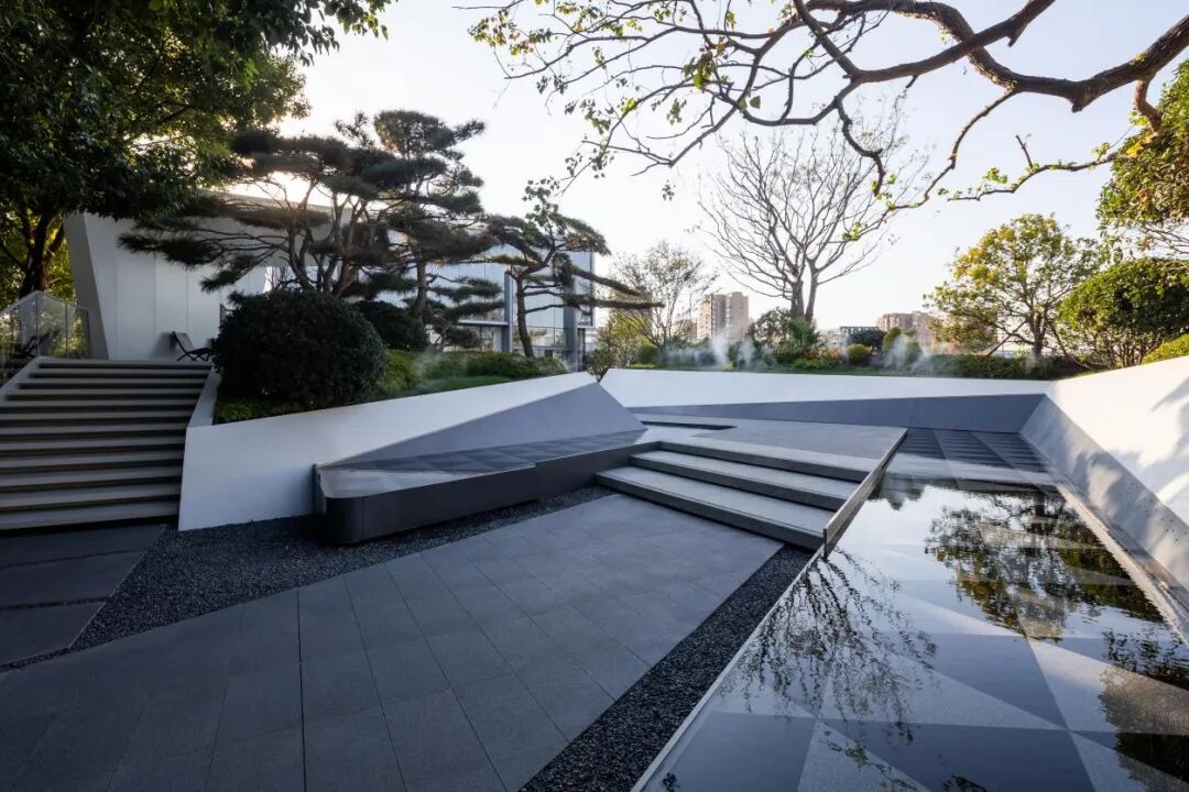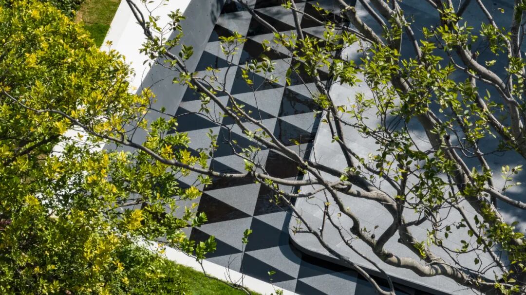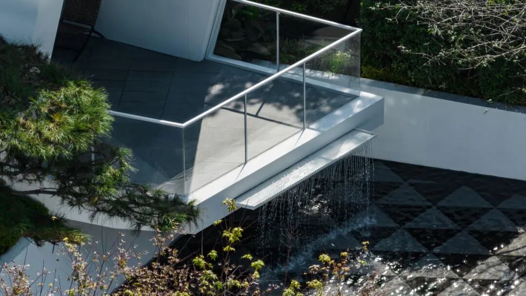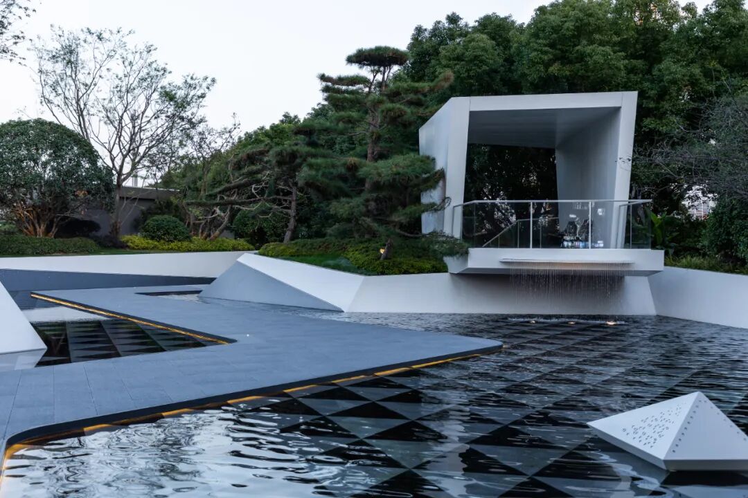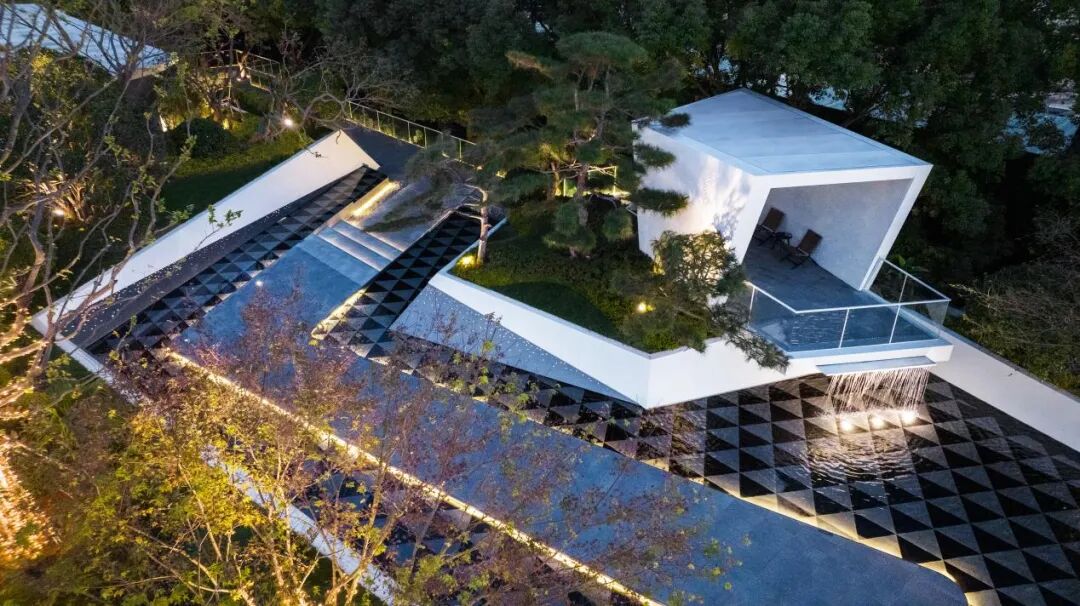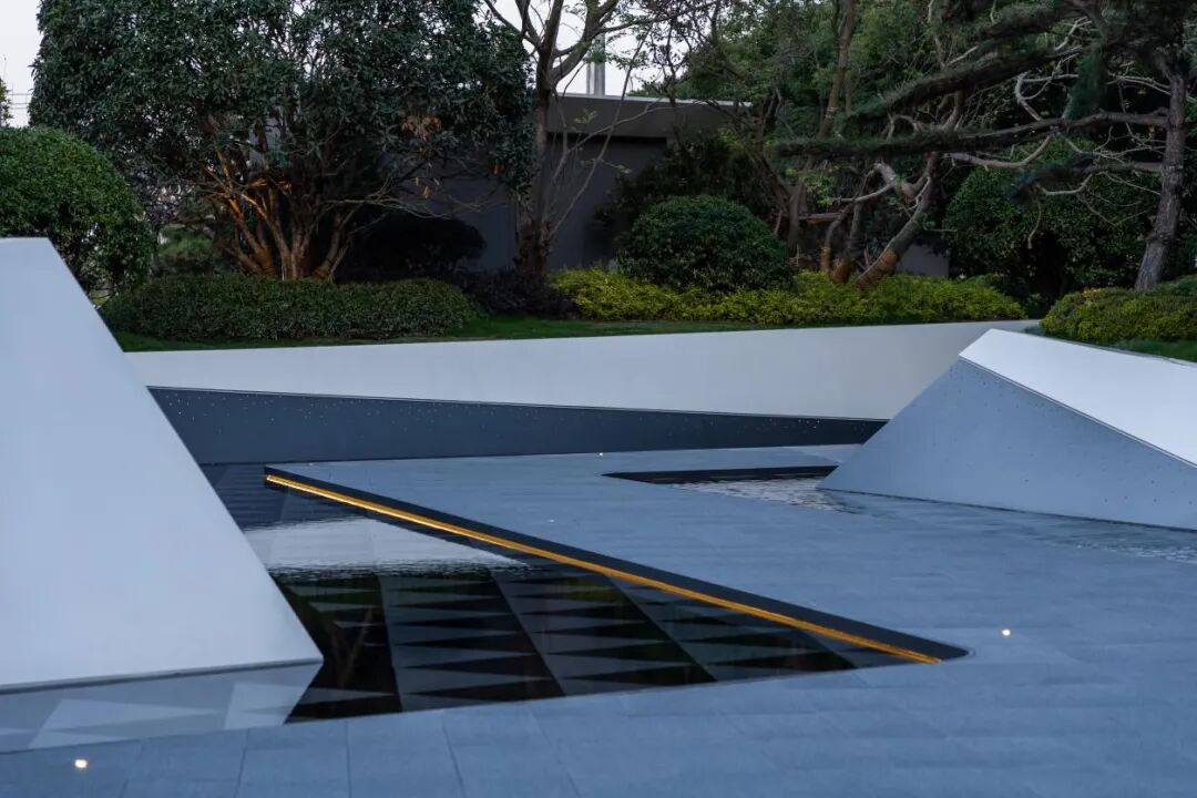 极简的折叠几何线条营造出藏于自然的艺术气息,净白的墙面 树影阑珊,水影交相。